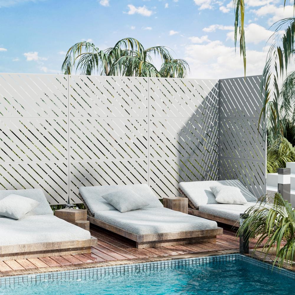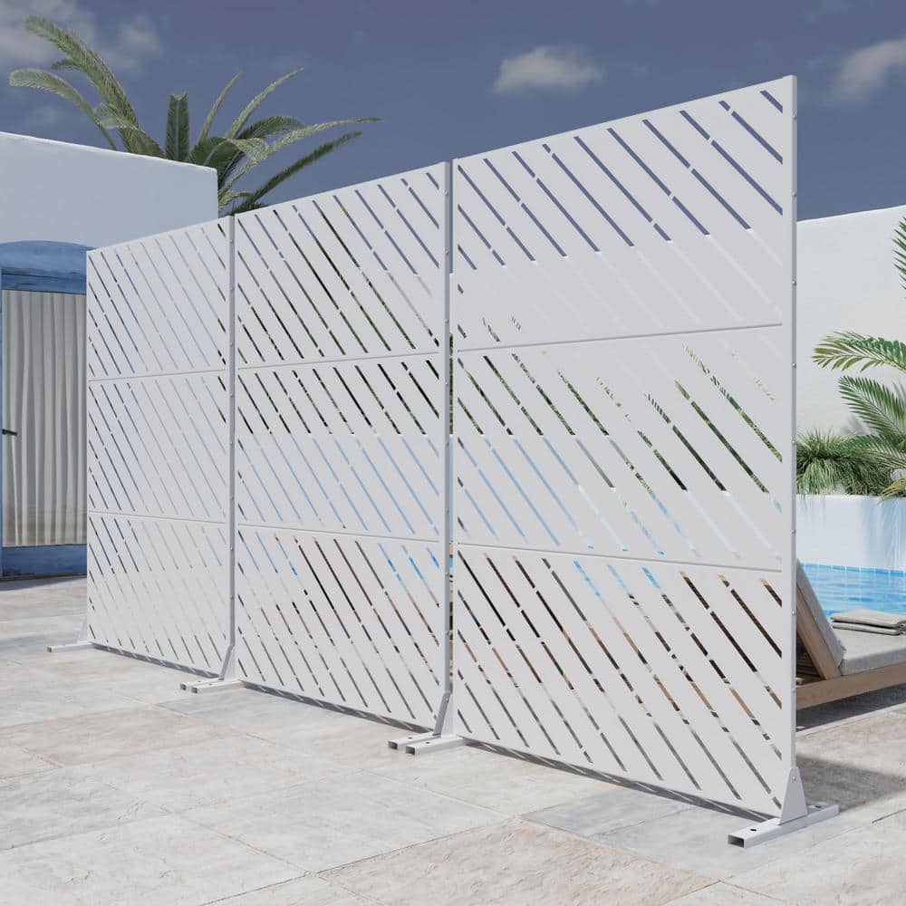 The Lirago 72 in. x 47 in. White Outdoor Metal Privacy Screen offers both seclusion and style for your outdoor space. With its durable, powder-coated galvanized steel construction and elegant laser-cut patterns, this decorative screen is perfect for creating private areas or serving as a stunning wall applique.