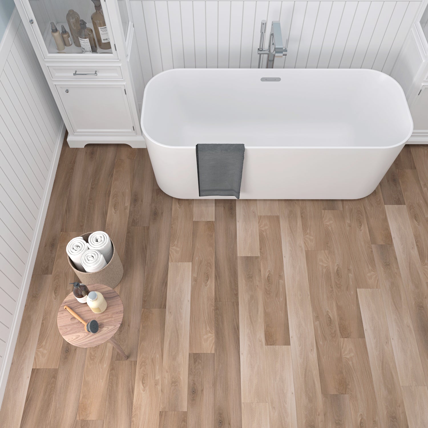 BaseCore Honey by Lucida USA brings the warm look of wood in an easy DIY peel-and-stick vinyl plank. With a 2mm thickness, 12 mil wear layer, and waterproof construction, it’s a durable choice for busy residential spaces.