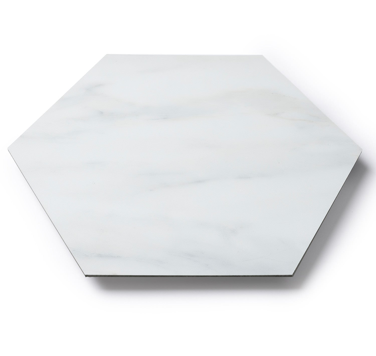 A: Each hexagon tile measures 9 in wide by 10-7/16 in long and is 3mm thick.
