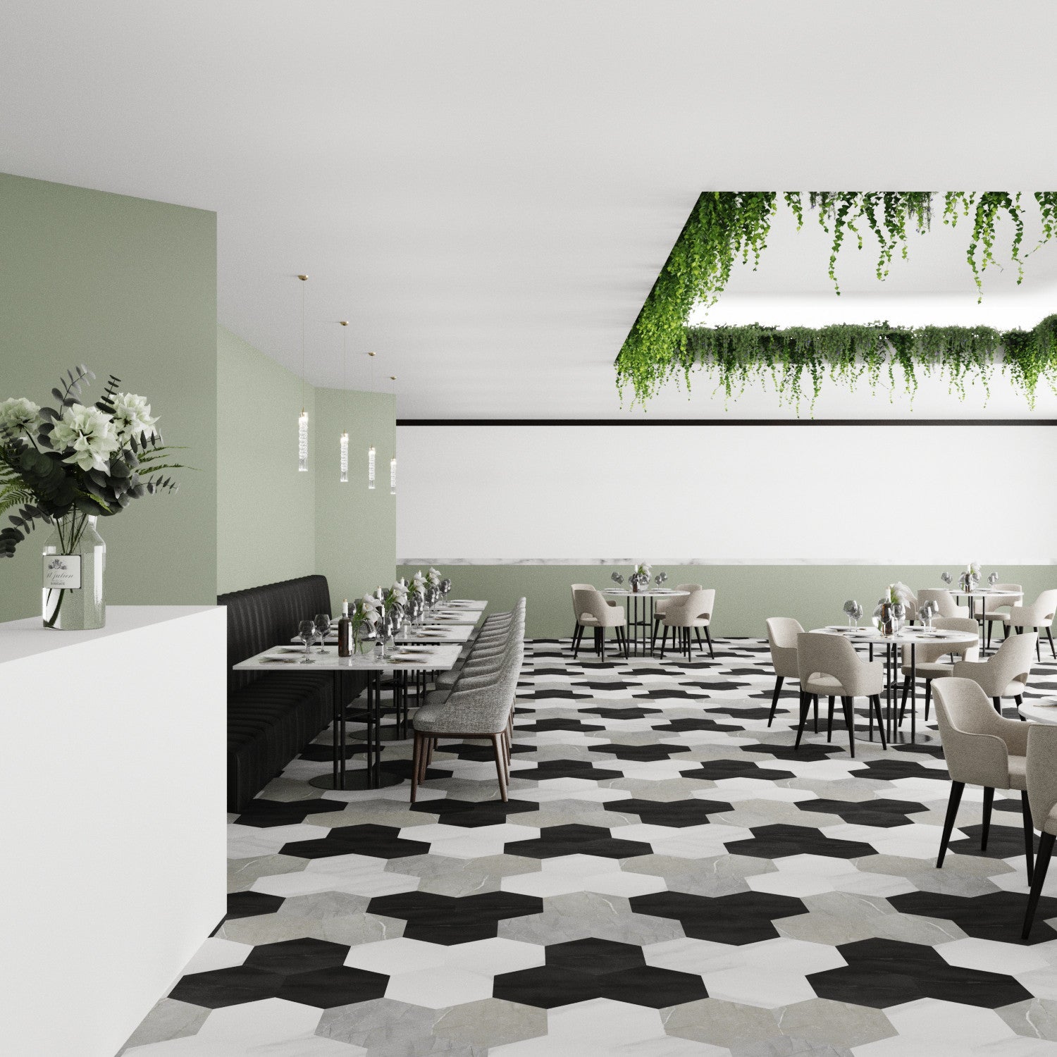 Blanco Ibiza brings a whisper of marble veining to a crisp hexagon silhouette, creating a floor that feels both tailored and timeless. The matte, stippled finish softens light, lending calm to lively hospitality settings. Mix with solid black or grey hexes to draft bold pathways or ombré fields that guide guests through the room. It’s a refined foundation—quiet luxury underfoot.