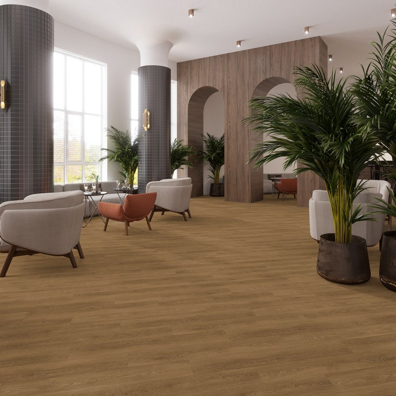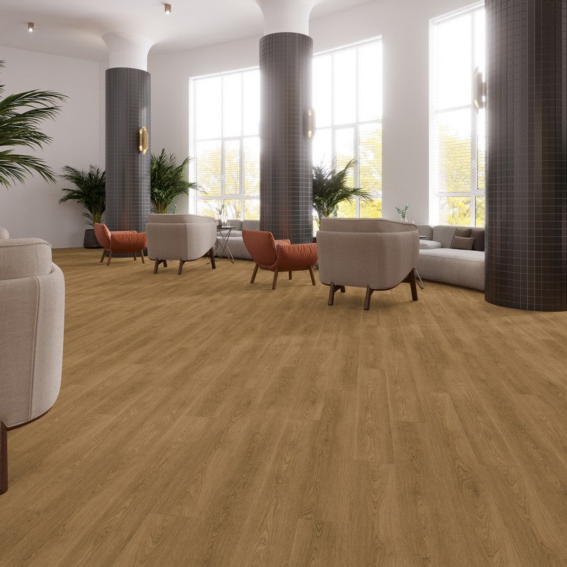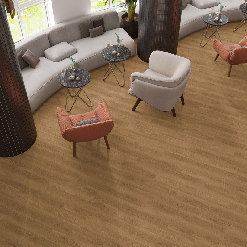 • Commercial Durability: 28 mil wear layer and 5 mm thickness stand up to high-traffic environments