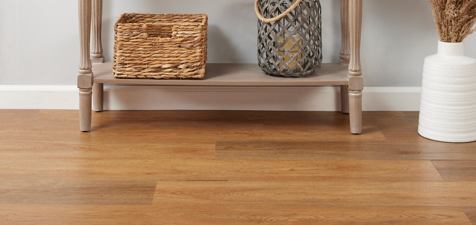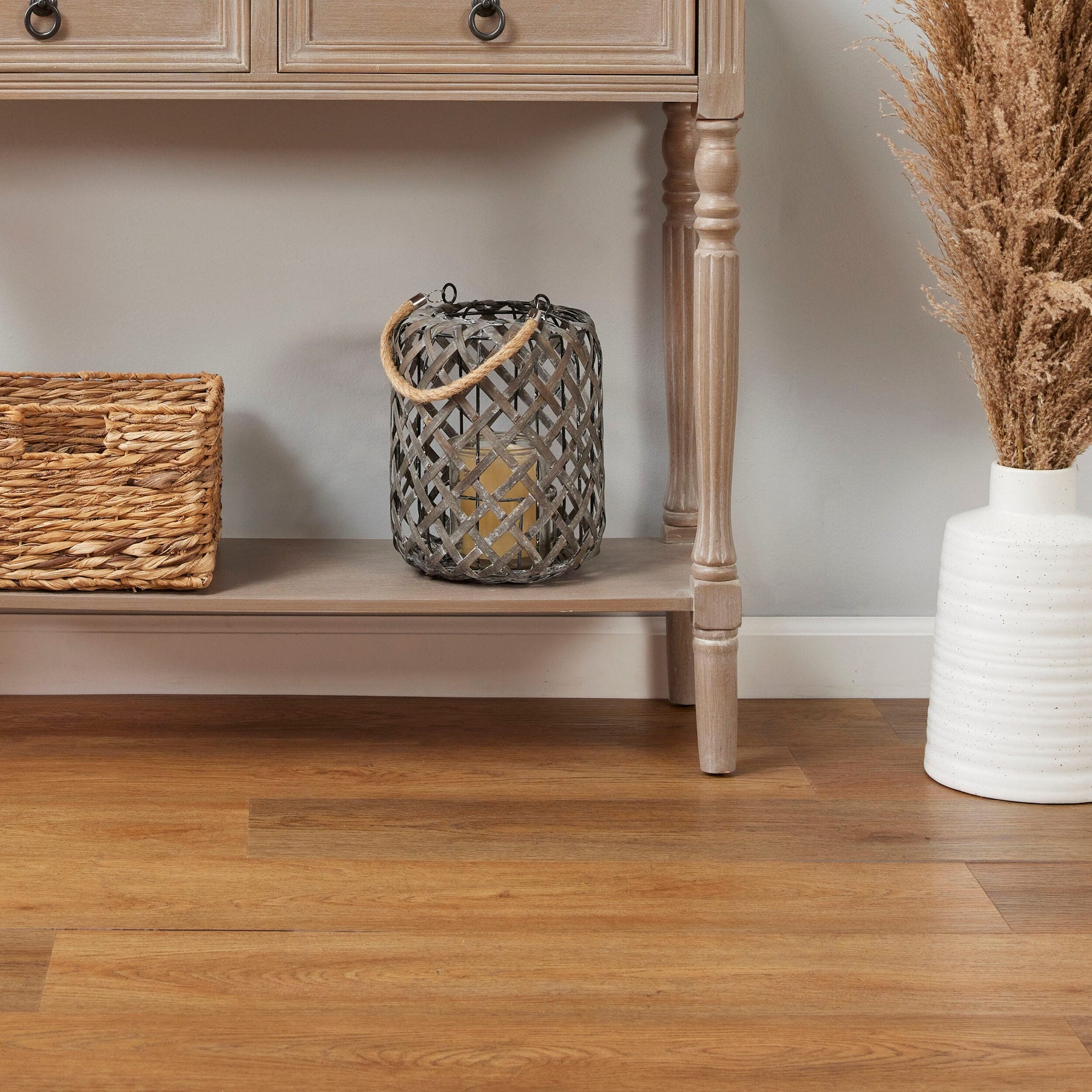 Woodmere’s golden-brown grain brings a grounded warmth that instantly polishes a room. The wide plank profile feels modern yet timeless, with subtle texture that catches the light just so. Style it under light oak furnishings and woven accents for a layered, coastal calm. This resilient LVP is a luxe essential—beautiful, practical, and effortlessly chic.