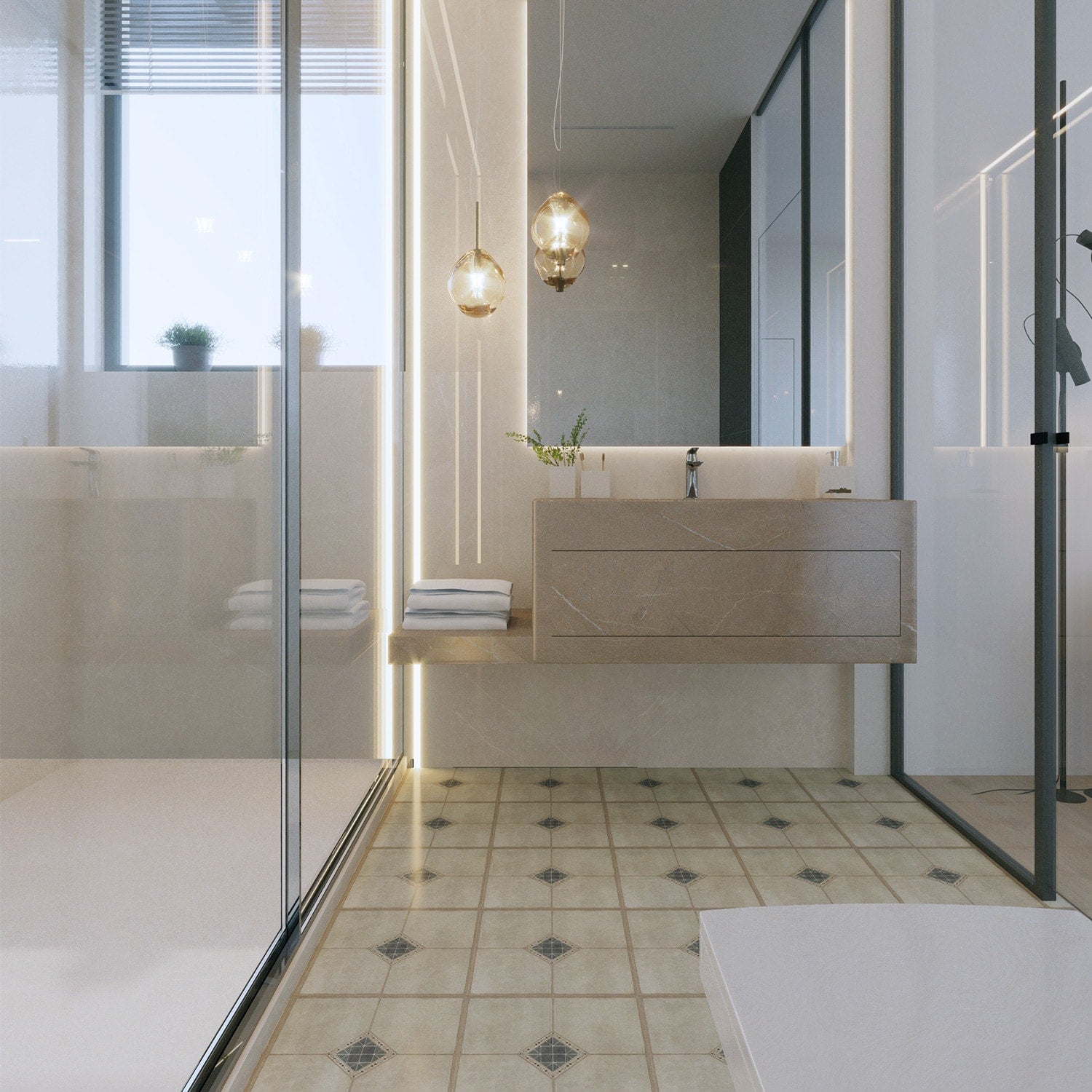 BaseCore Calabrian lays down a storied, patterned tableau—creamy stone squares punctuated by a jewel-toned medallion—instantly elevating everyday rooms. The subtle, low-gloss finish feels timeless while the crisp geometric accent gives it a tailored edge. Pair it with warm woods and brushed brass to create a refined, spa-like retreat. It’s the chic shortcut to luxe living without the fuss.