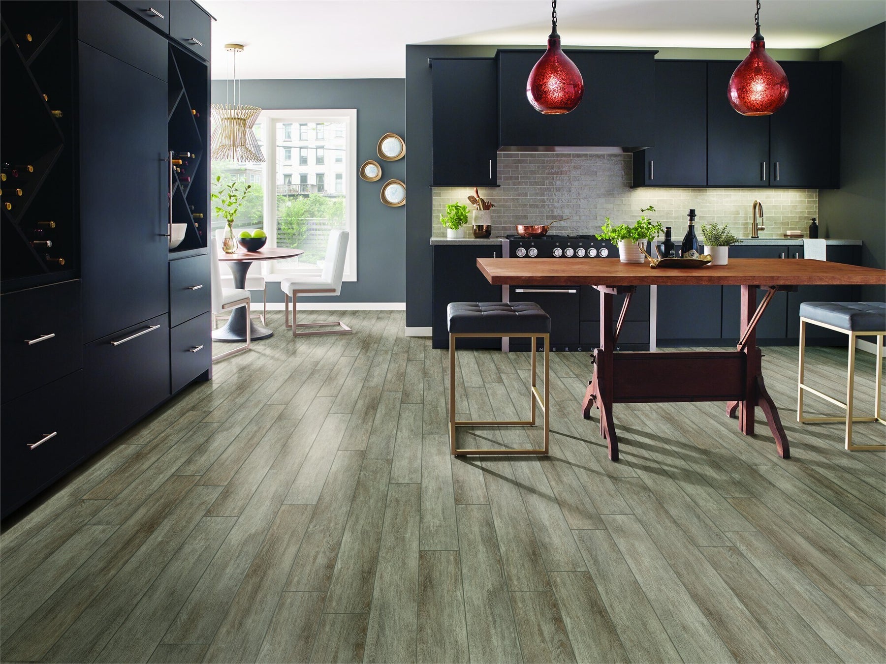 This plank brings a quiet sophistication—cool, brushed oak tones that ground the room with calm, modern elegance. The low-gloss finish and beveled edges deliver a tailored look that pairs beautifully with matte black cabinetry or warm brass accents. Run the boards lengthwise to elongate the space and let the subtle grain create a gentle rhythm underfoot. It’s a chic, waterproof foundation that feels luxurious yet lives easily day to day.