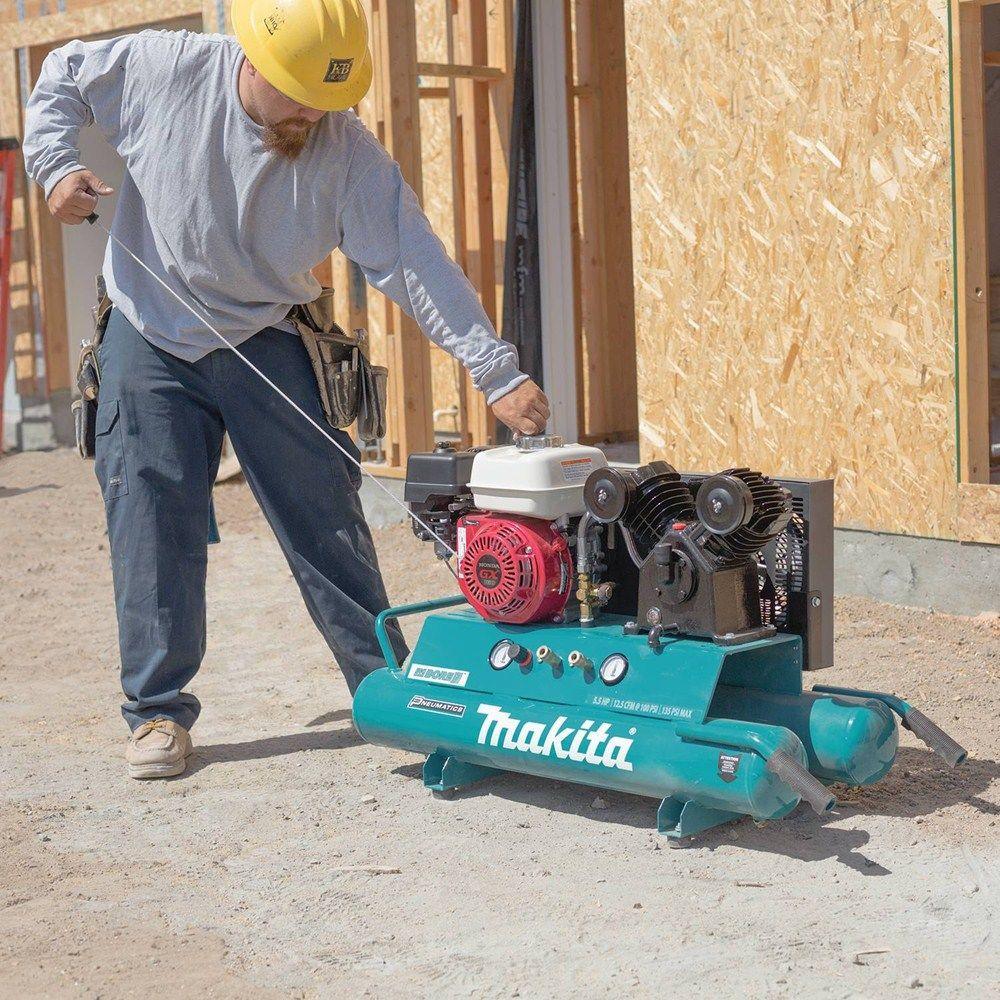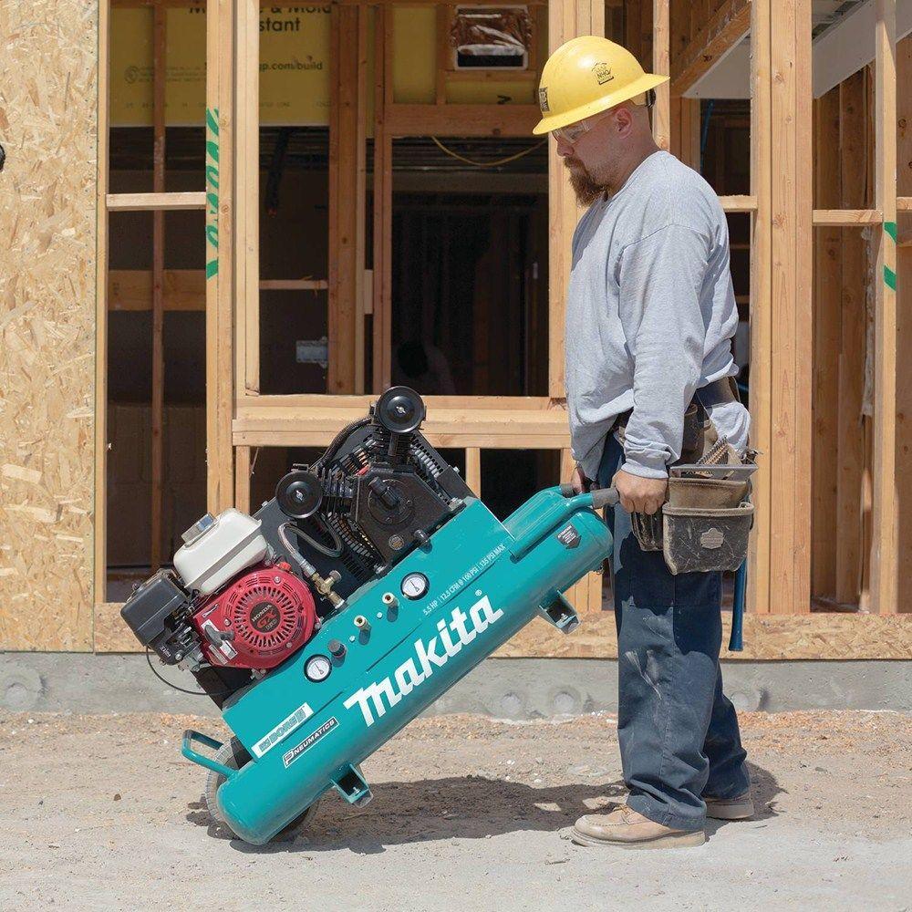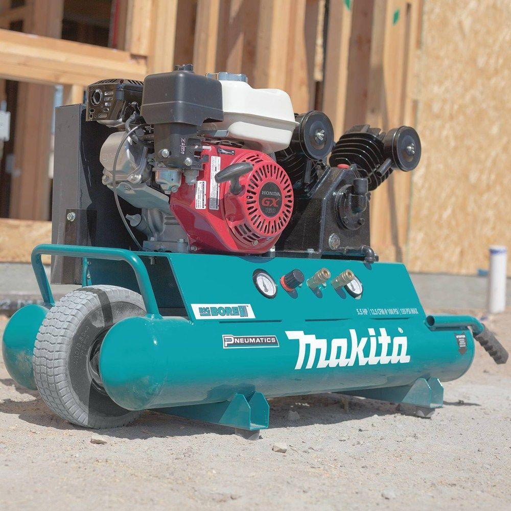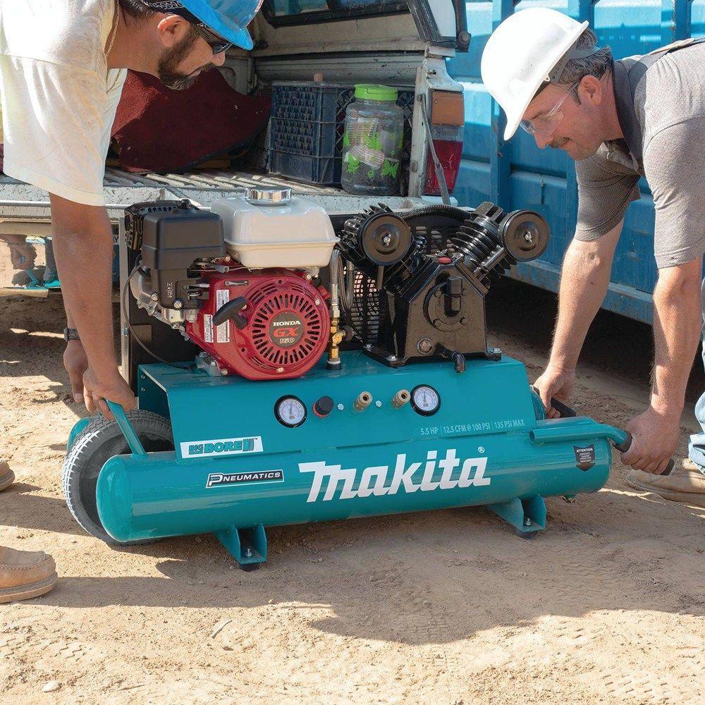 Compressors are workhorse tools on the job site and Makita compressors are contractor favorites for their faster recovery time, lower noise, longer tool life and consistent job site performance. The 5.5 HP Big Bore Gas Air Compressor (MAC5501G) has a powerful Honda GX160 4-stroke engine for increased performance and superior reliability, with a V-Twin style pump that runs cooler and provides up to 12.5 CFM at 100 psi for faster recovery. Cast iron pump with Big Bore cylinder and piston is engineered to provide durability and faster recovery time for improved performance. And unlike other gas compressors, the gauges and couplers on the MAC5501G are built into the base of the motor and pump for additional protection and added durability.