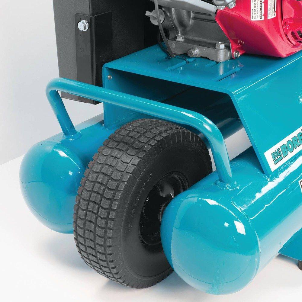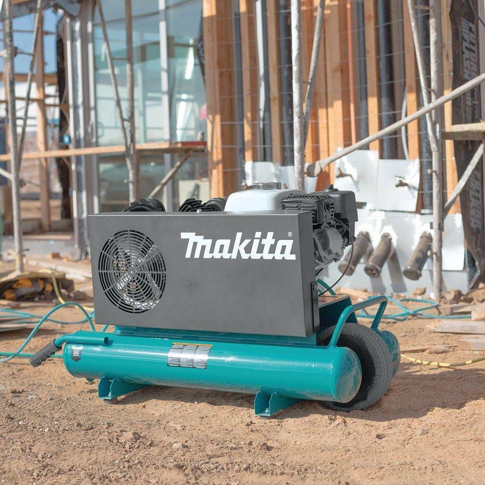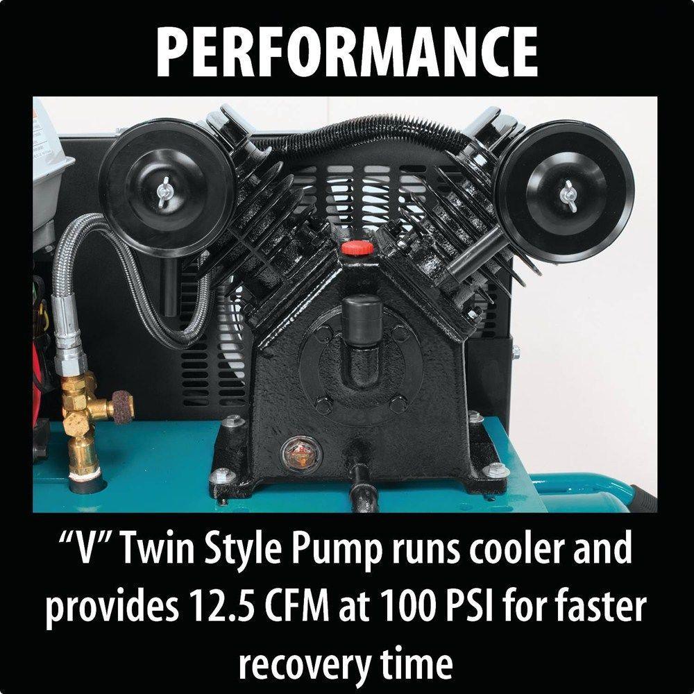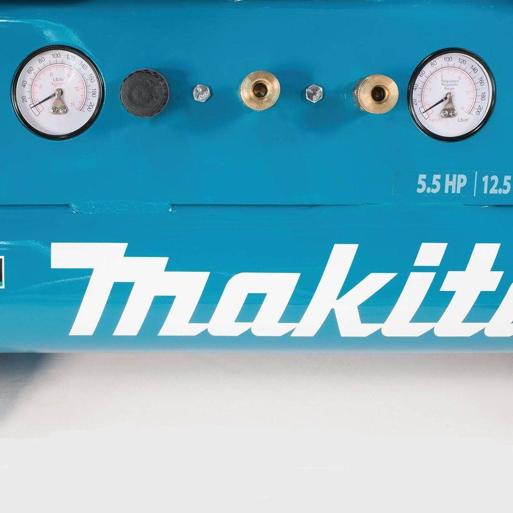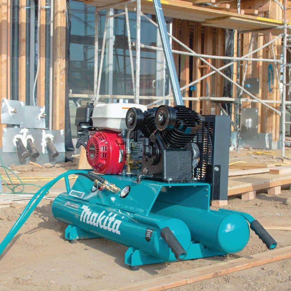 Compressors are workhorse tools on the job site and Makita compressors are contractor favorites for their faster recovery time, lower noise, longer tool life and consistent job site performance. The 5.5 HP Big Bore Gas Air Compressor (MAC5501G) has a powerful Honda GX160 4-stroke engine for increased performance and superior reliability, with a V-Twin style pump that runs cooler and provides up to 12.5 CFM at 100 psi for faster recovery. Cast iron pump with Big Bore cylinder and piston is engineered to provide durability and faster recovery time for improved performance. And unlike other gas compressors, the gauges and couplers on the MAC5501G are built into the base of the motor and pump for additional protection and added durability.