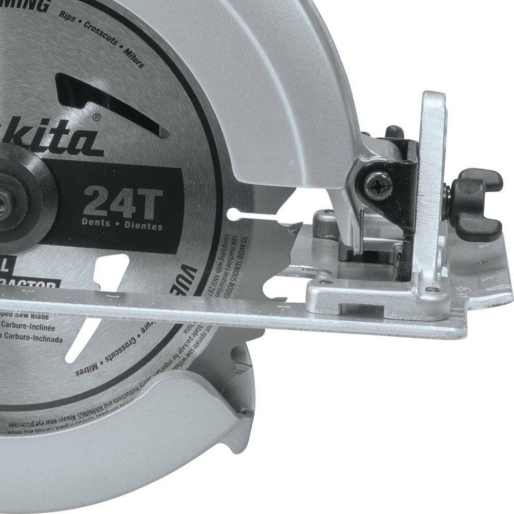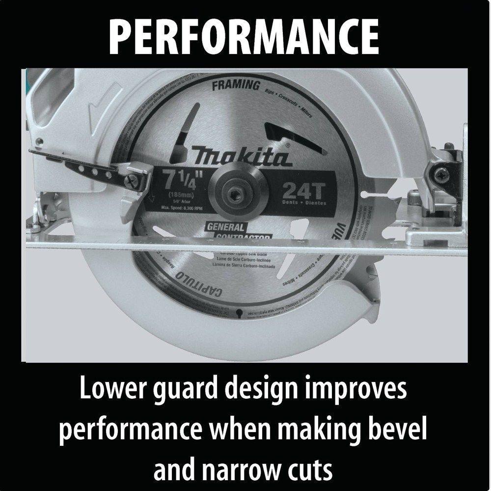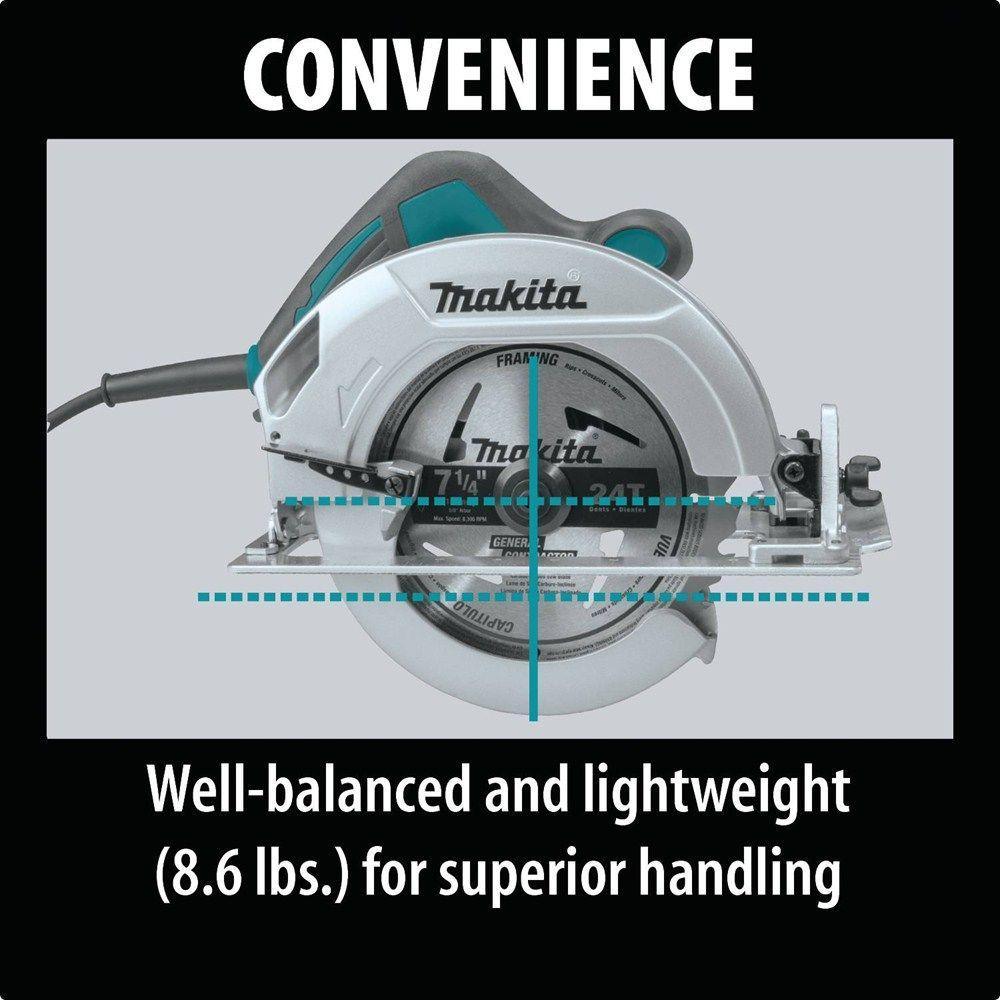 Makita engineered the 7-1/4 in. Circular Saw (model HS7600) with pro framers in mind, combining power and performance with ease-of-use features, superior balance, less weight and job site durability. The HS7600 is a more compact saw that is ideal for a range of framing and cutting applications. The HS7600 has a powerful 10.5 Amp motor and weighs only 8.6 lbs. for a high power-to-weight ratio. It has a heavy gauge aluminum wraparound base engineered for improved durability and straighter cuts. The large cutting capacity (2-1/2 in. at 90°, 1-5/84 in. at 45°) with a maximum bevel capacity of 0°-45° is ideal for most common angles. Ease of use features include easy-to-read markings on the depth and bevel scales, on-board blade wrench and a flat motor housing design for stability when changing the blade. The lower guard design improves performance when making bevel and narrow cuts. The HR7600 includes a Makita 7-1/4 in. 24T Framing Blade delivers faster, cleaner cuts. The carbide tips are specifically set to withstand the harshest conditions such as plowing through nail-embedded wood. The HR7600 is engineered for framing walls, siding, roofs and floors using a range of dimensional lumber and engineered lumber including OSB, LVL, PSL, plywood and more. It is ideal for framers, builders, masons, carpenters and general contractors seeking a best-in-class 7-1/4 in. circular saw with less weight and superior balance.
