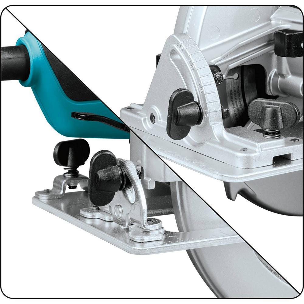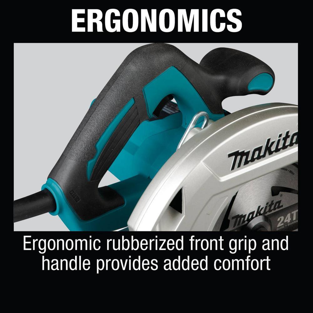 Makita engineered the 7-1/4 in. Circular Saw (model HS7610) with pro framers in mind, combining power and performance with ease-of-use features, superior balance, less weight and job site durability. It also includes a dust nozzle accessory that directs material away from the operator and easily connects to a vacuum for improved dust extraction. It is ideal for a range of framing and cutting applications. The HS7610 has a powerful 14 Amp motor and weighs only 8.7 lbs. for a high power to weight ratio. It has a heavy-gauge aluminum wraparound base engineered for improved durability and straighter cuts. The large cutting capacity (2-1/2 in. at 90, 1-3/4 in. at 45) with a maximum bevel capacity of 0° to 45° is ideal for most common angles. Ease-of-use features include easy-to-read markings on the depth and bevel scales, on-board blade wrench and a flat motor housing design for improved stability when changing the blade. The lower guard design improves performance when making bevel and narrow cuts. The HR7610 includes a Makita 7-1/4 in. 24T Framing Blade engineered to deliver faster, cleaner cuts. The carbide tips are specifically set to withstand the harshest conditions such as plowing through nail-embedded wood. The HR7610 is ideal for framing walls, siding, roofs and floors using a range of dimensional and engineered lumber including OSB, LVL, PSL, plywood and more. It is ideal for framers, builders, masons, carpenters and general contractors.