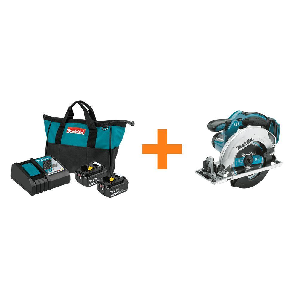 Build your own Makita tool kit with the 18-Volt Lithium-Ion Battery and Rapid Optimum Charger Starter Pack. Makita offers over 225 cordless tools that utilize 18-Volt lithium-ion batteries, most available as bare tools (tool only, no batteries or charger included). Pick up the Makita Battery and Rapid Optimum Charger Starter Pack, then purchase the 18-Volt bare tools you need to get the job done. It's an ideal way to start building a Makita LXT Cordless System. Makita 18-Volt Lithium-Ion Batteries resist self-discharge, so theyre ready for use even after long periods of storage. The Makita Rapid Optimum Charger is a smart-charging system that communicates with the battery during the charging process to monitor current, voltage and temperature. This advanced charging technology helps optimize battery life and deliver a faster charge. In addition, the Charger has a built-in fan to cool the battery for faster and more efficient charging, even in hot weather conditions. For improved tool performance and extended battery life, Makita created Star Protection Computer Controls. Star Protection is communication technology that allows the tool and battery to exchange data in real time and monitor conditions during use to protect against overloading, over-discharging and overheating. This Promotion also comes with a bonus XSS02Z 18-Volt LXT Lithium-Ion Cordless 6-1/2 in. Circular Saw, Tool Only.