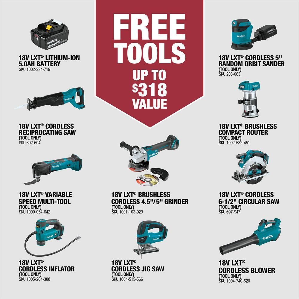 18-Volt LXT Brushless 2-Pc Combo Kit 5.0Ah with bonus 18V LXT 5 in. Random Orbit Sander and 18V LXT Jigsaw