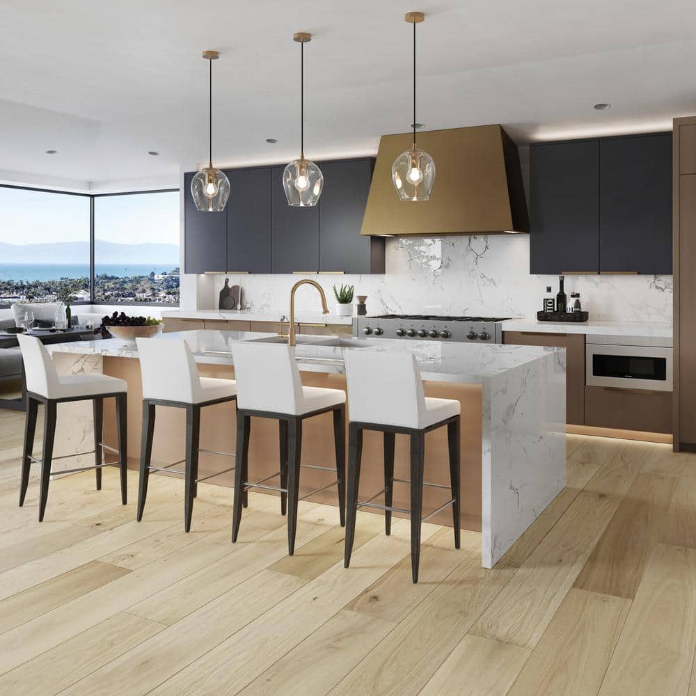 The Benecia French Oak Engineered Hardwood Flooring is a masterpiece in design, transforming any room into a haven of sophistication. Its gentle wirebrushed texture dances with light, creating a warm ambiance that recalls the charm of historic European interiors. Imagine this timeless flooring gracing your entryway or living room, paired with plush area rugs and dramatic lighting that highlight its luster. Essential for those who value understated luxury, this flooring is the cornerstone of a truly opulent home design.
