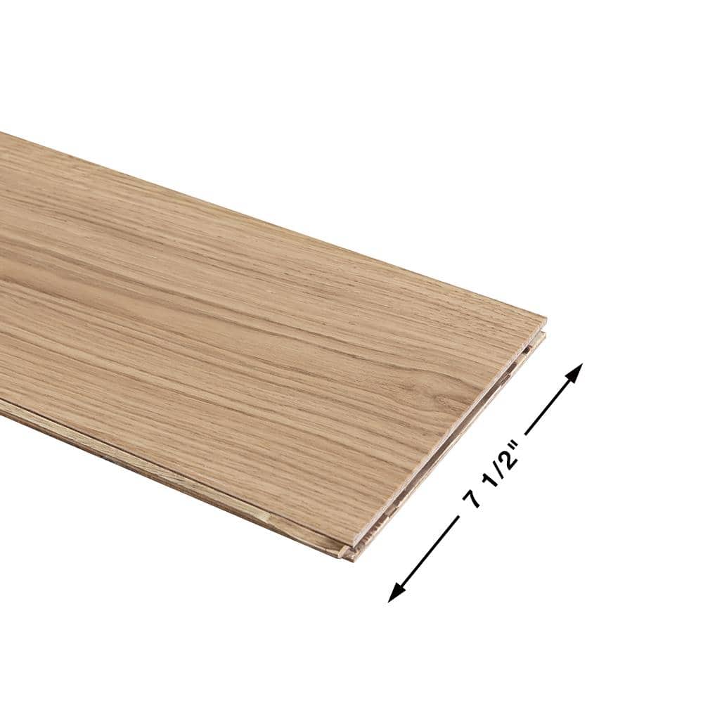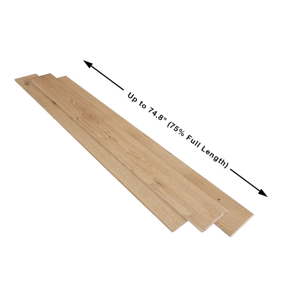 A: Each plank measures 9/16 in. thick, 7.5 in. wide, with lengths varying between 23.6 in. to a generous 74.8 in.