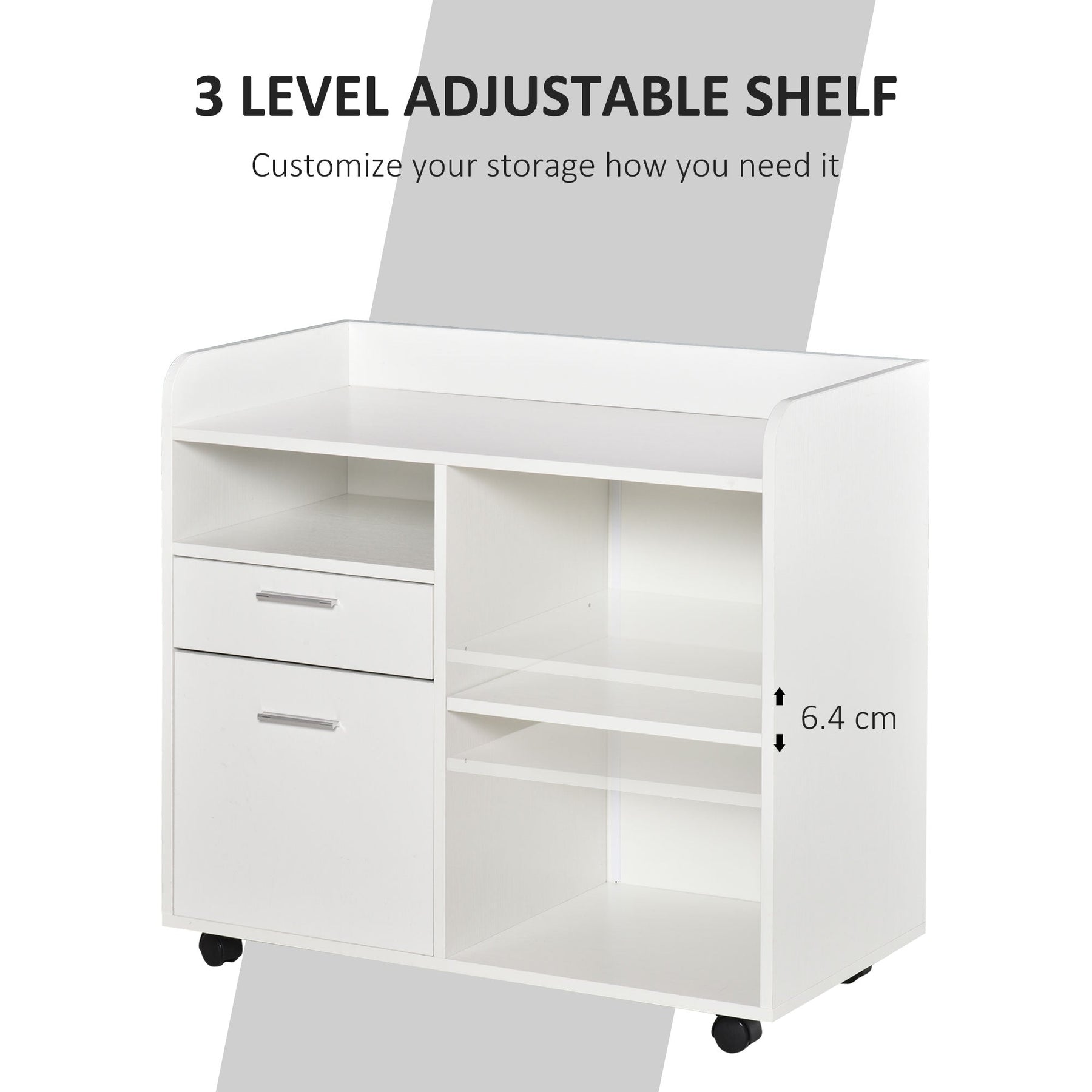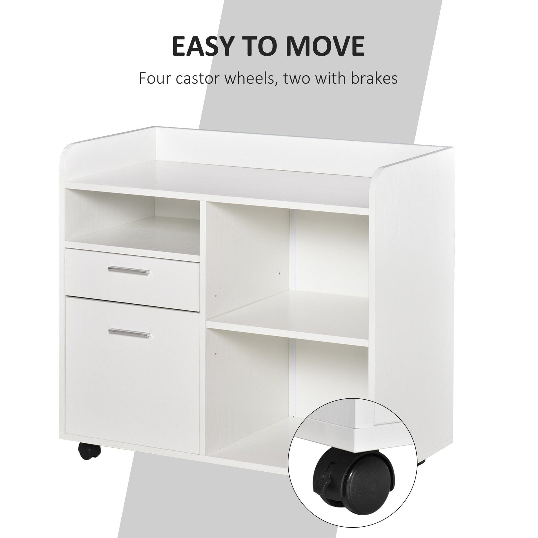 A: The cabinet is fitted with four 360° smooth-rolling casters, making it easy to move around as needed, with brakes on two wheels for added stability.