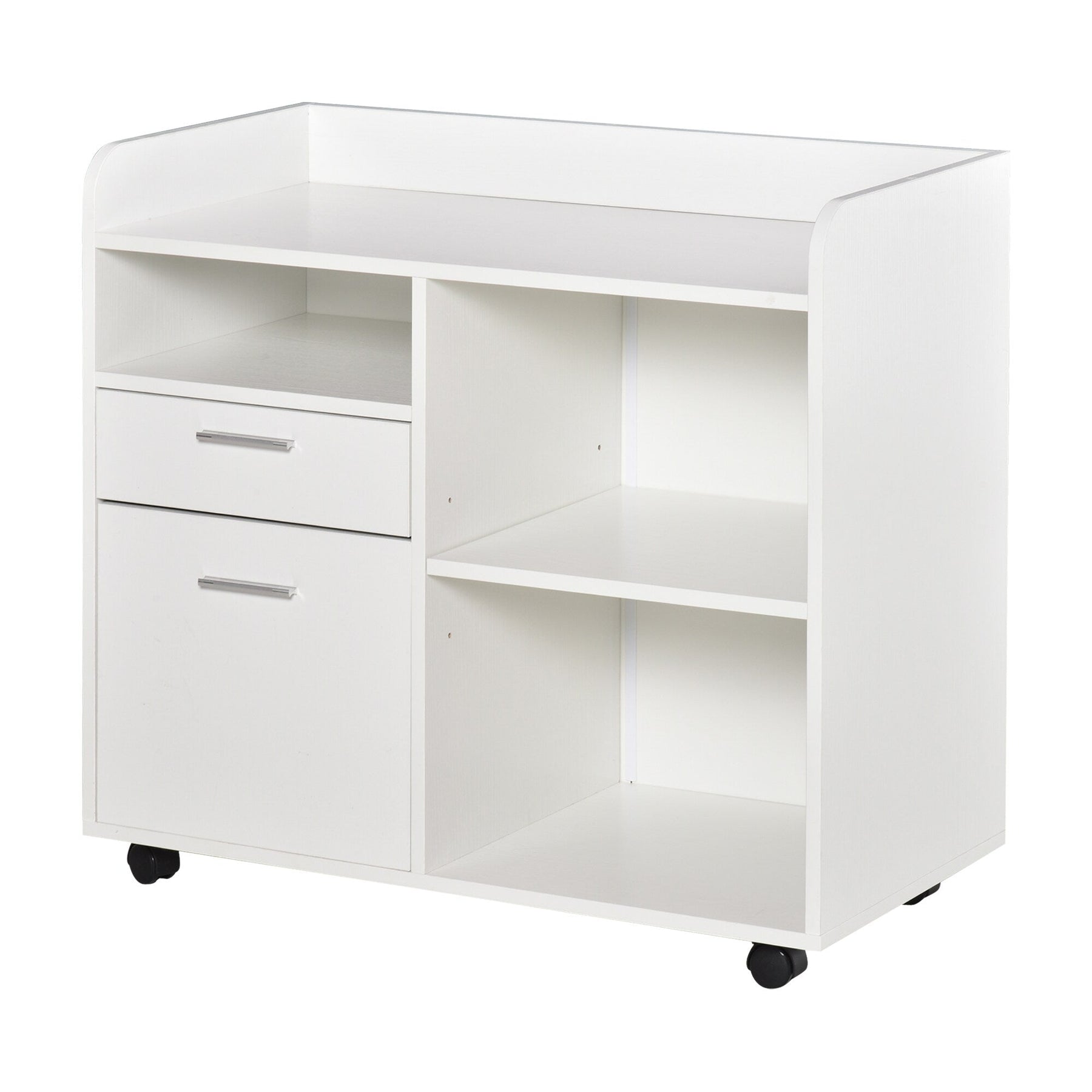 Enhance your home office with the Maocao Hoom White 2-Drawer Mobile File Cabinet. This modern and versatile piece combines open storage space with two letter-size file drawers, allowing you to organize your workspace with style and ease. Its durable composite wood constructs a sturdy foundation, while the adjustable shelves and smooth-rolling casters provide unmatched functionality.