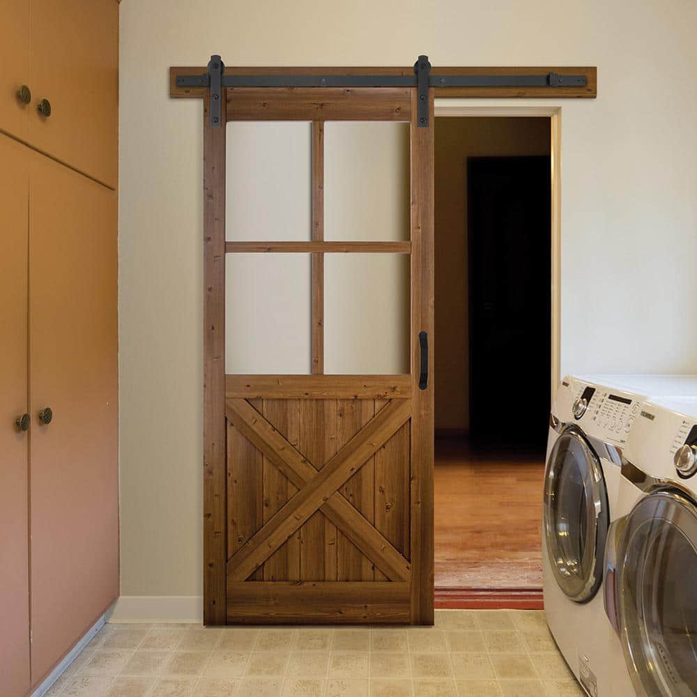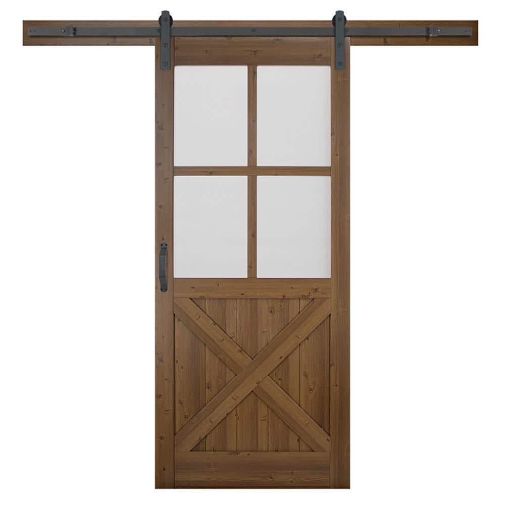 Masonite 36 in. x 84 in. 4-Lite Crossbuck Nutmeg Interior Sliding Barn Door Slab with Hardware Kit