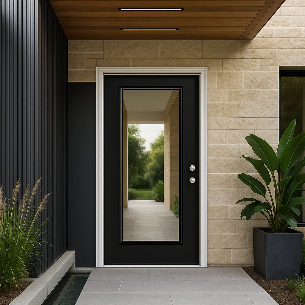 Channeling the bold sophistication of contemporary design, this Masonite Full Lite Jet Black Front Door instantly elevates any home's entrance. The expansive glass panel invites natural light, creating a seamless connection between indoors and out, while the jet black finish offers a striking contrast against any facade. I adore the crisp, smooth lines and the subtle gleam of nickel hinges—perfect for pairing with sleek hardware or vibrant seasonal wreaths. This door is more than an entry; it's a declaration of style and a must-have for those who value both luxury and durability in their living spaces.