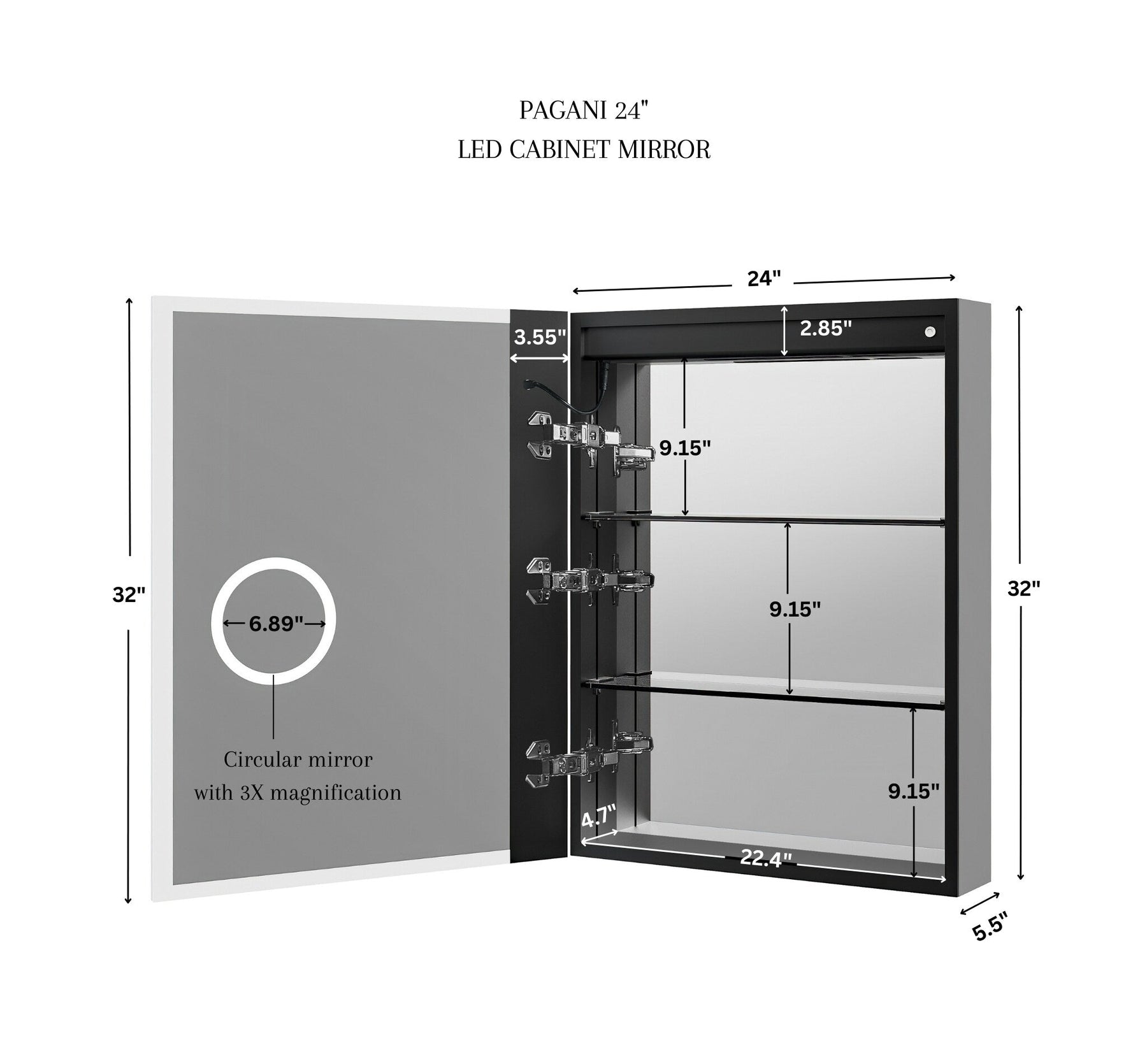 The Ancerre Designs Pagani Medicine Cabinet is a perfect blend of modern luxury and practicality. This 24x32-inch LED lighted cabinet is built with a fog-free mirror and features a soft-close mechanism, making it both silent and seamless. With its dual-outlet and USB capability, it effortlessly meets all your grooming needs.