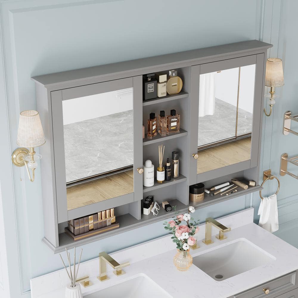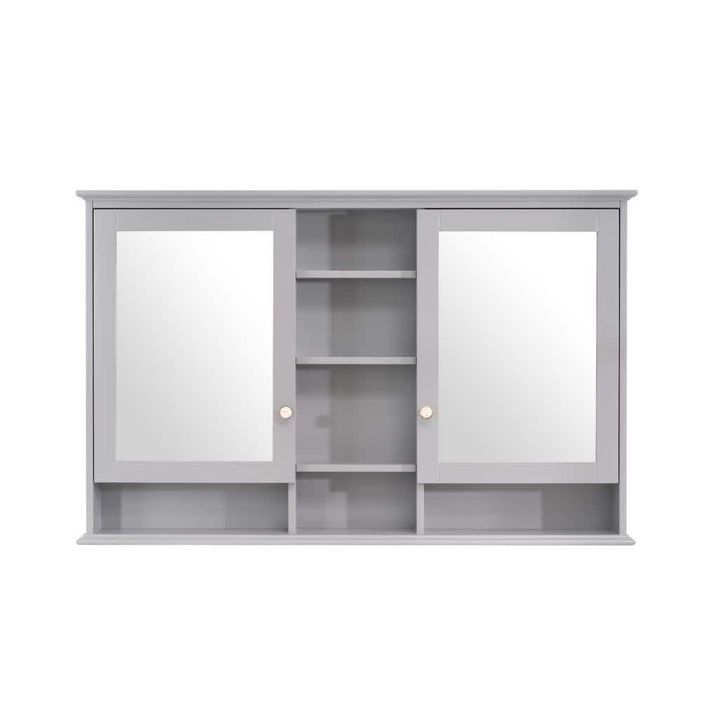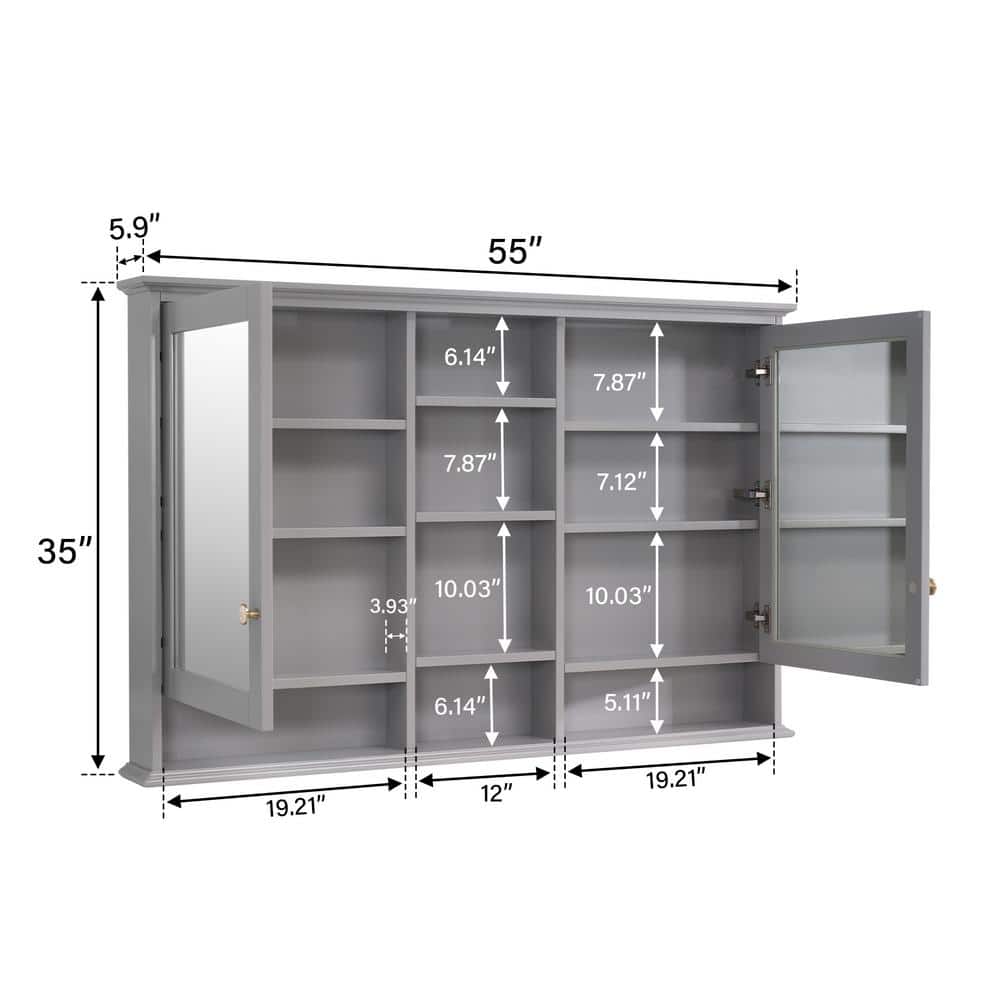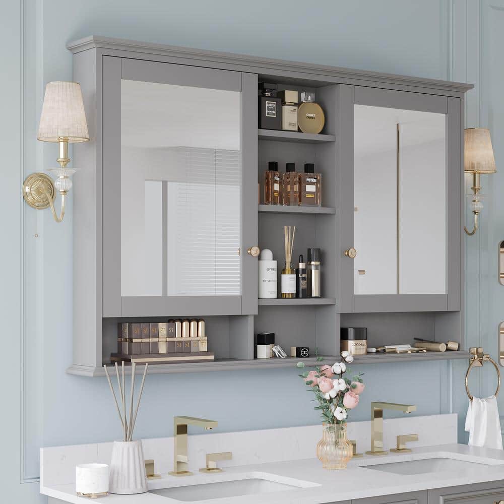 ANGELES HOME 55 in. W x 35 in. H Rectangular Solid Wood Bathroom Medicine Cabinet with Mirror, 2 Soft-Closed Doors, Easy Hang, Gray