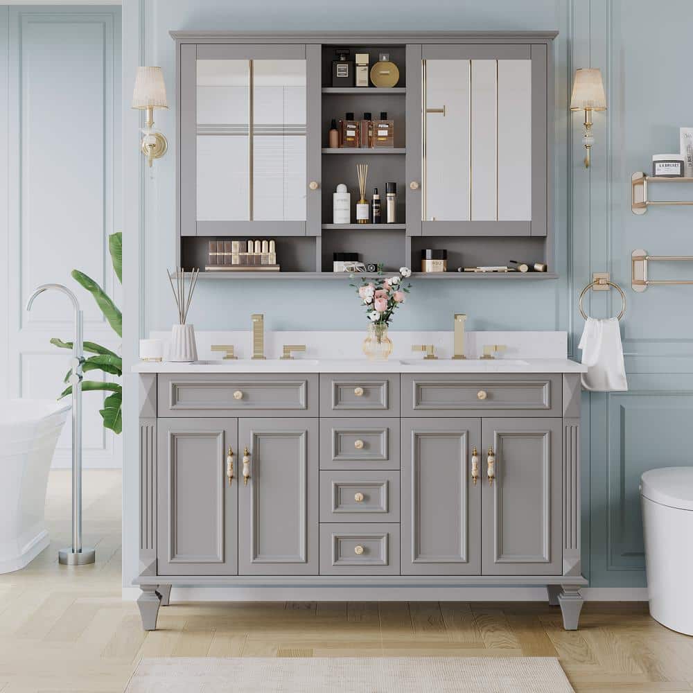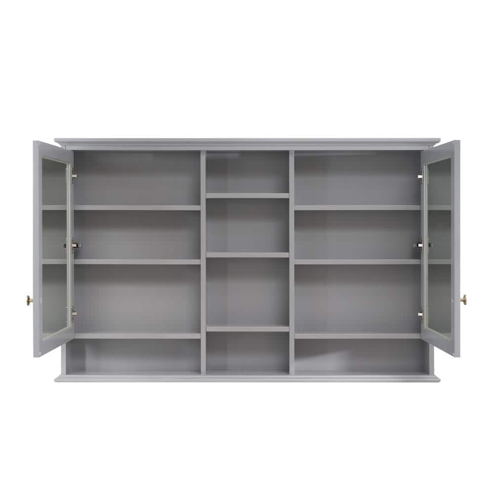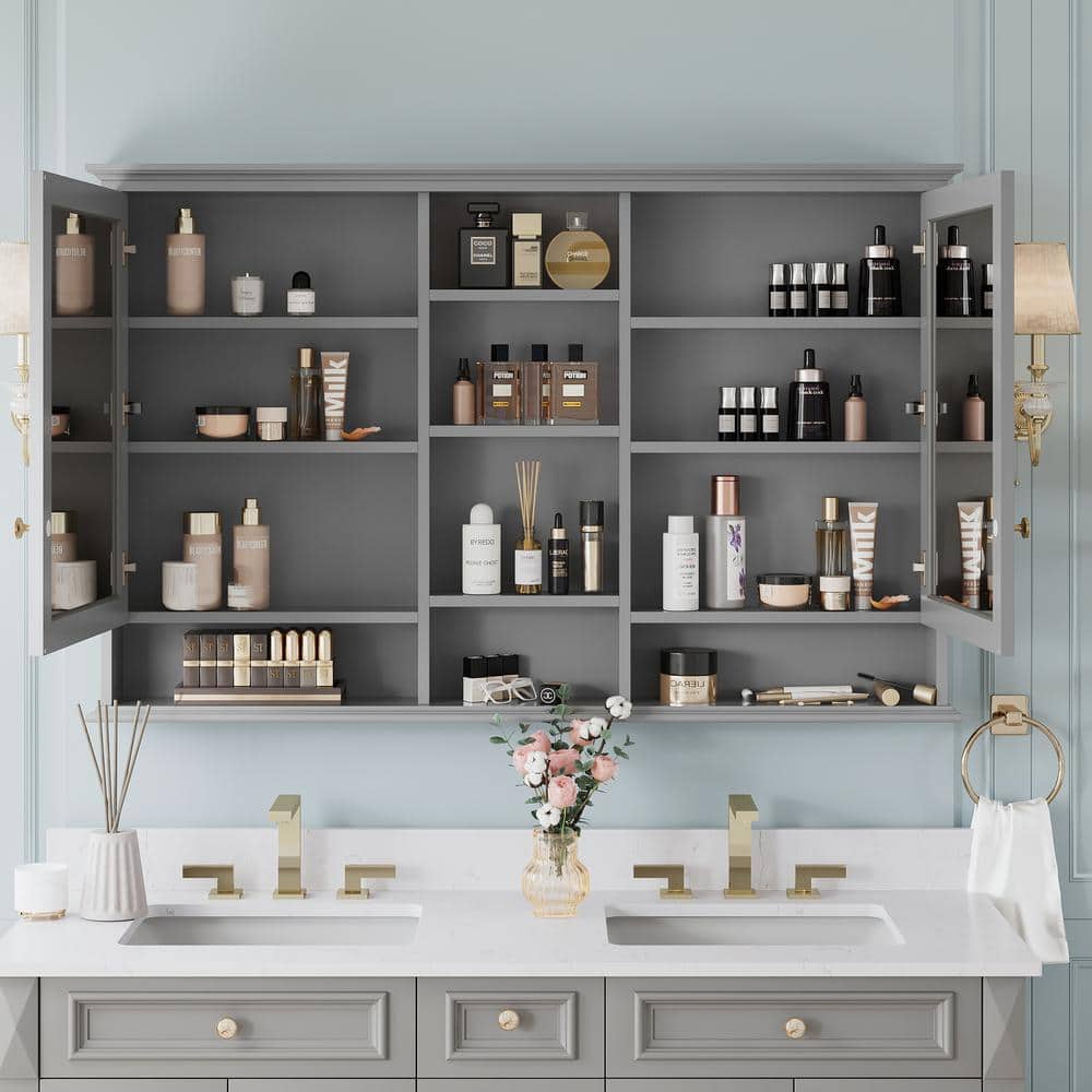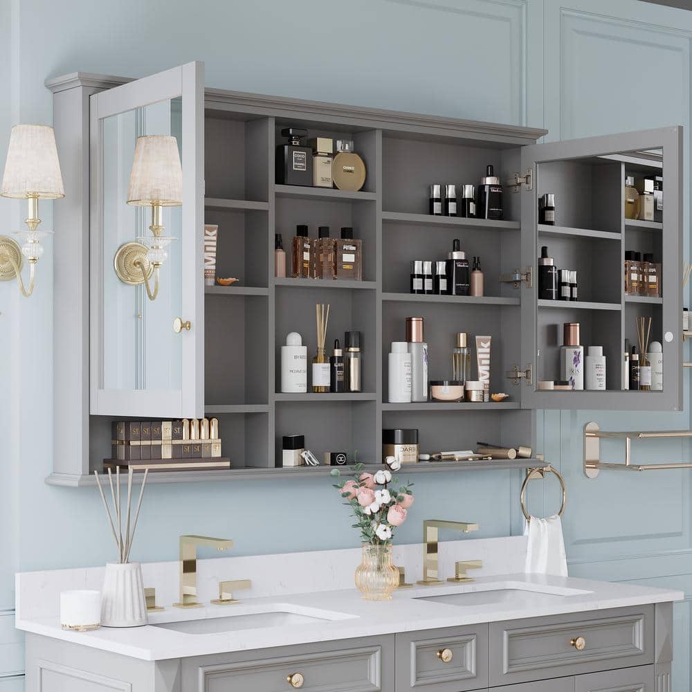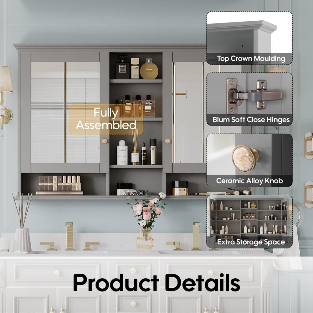 ANGELES HOME 55 in. W x 35 in. H Rectangular Solid Wood Bathroom Medicine Cabinet with Mirror, 2 Soft-Closed Doors, Easy Hang, Gray