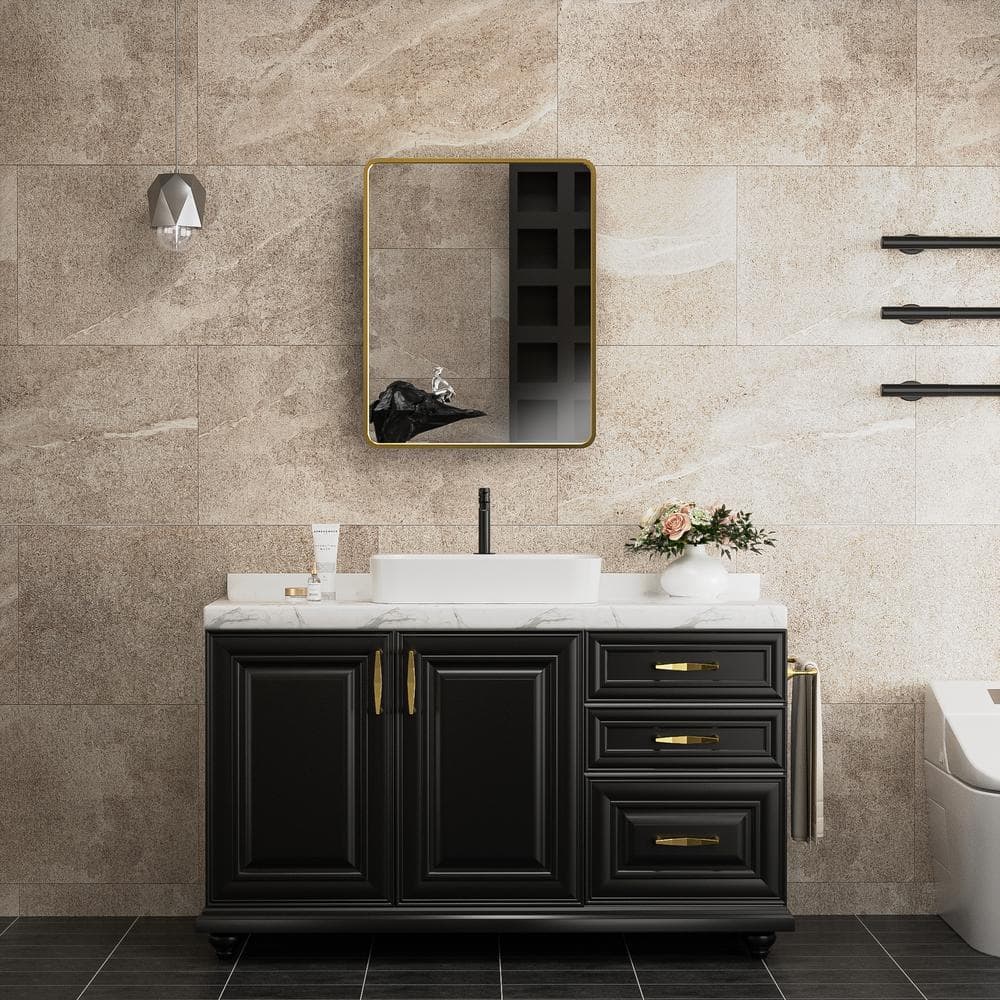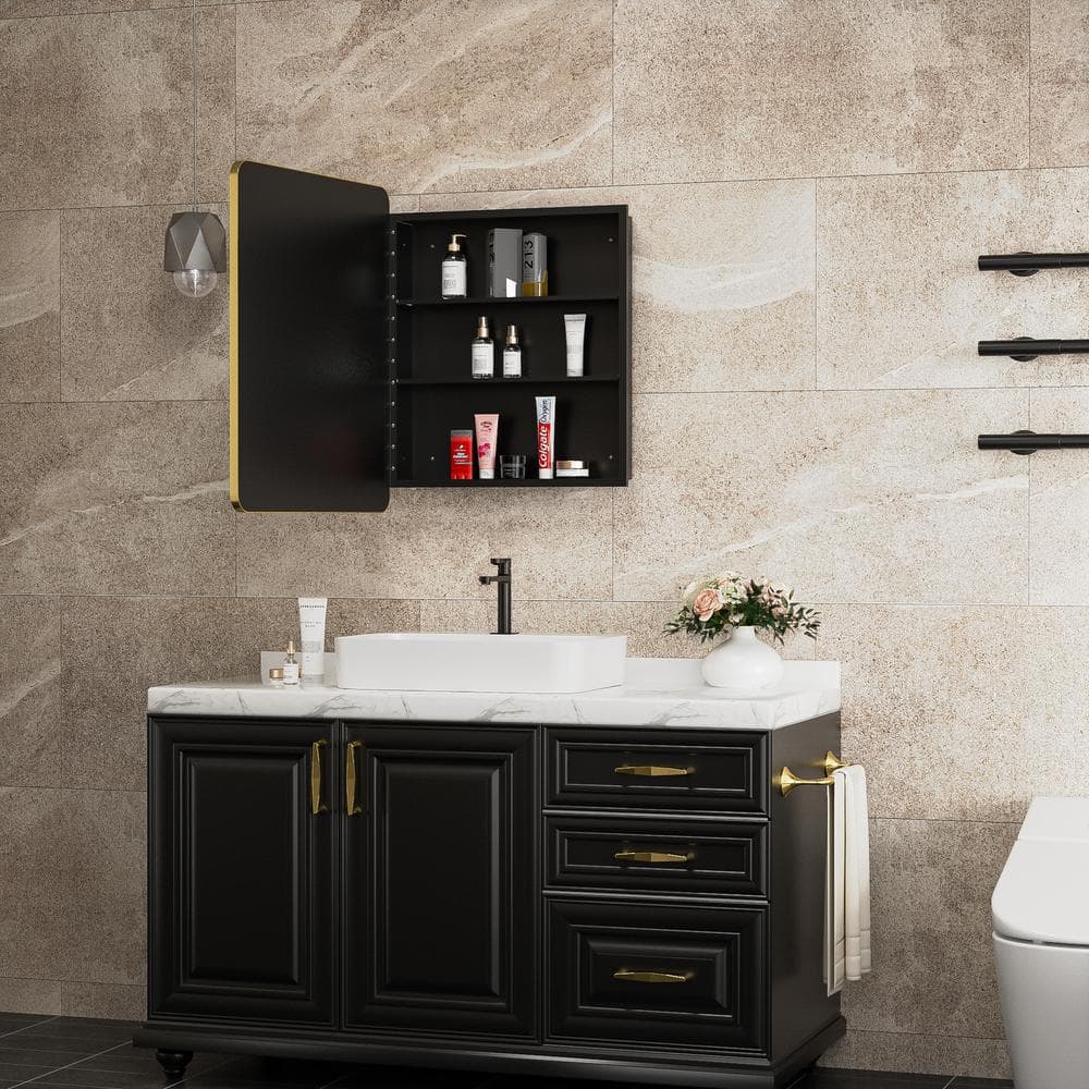 Step into a world where functionality meets sophistication with this Aosspy Gold Medicine Cabinet. Its dazzling gold frame doesn't just hold a mirror; it becomes the mirror, capturing all the light and warmth your space has to offer. Envision this cabinet adorning your bathroom, paired with plush whites and accents of deep green, creating a serene and luxurious oasis. The innovative design and slow-closing mechanism ensure that this piece isn’t just part of your everyday routine—it’s your daily indulgence into refinement.