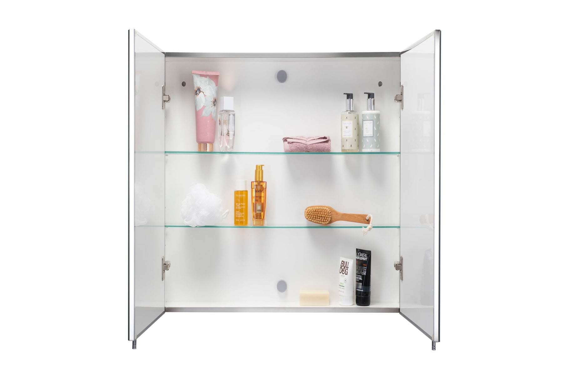 A: The cabinet features bi-view mirrored doors with soft close 120-degree hinges for smooth, controlled access.