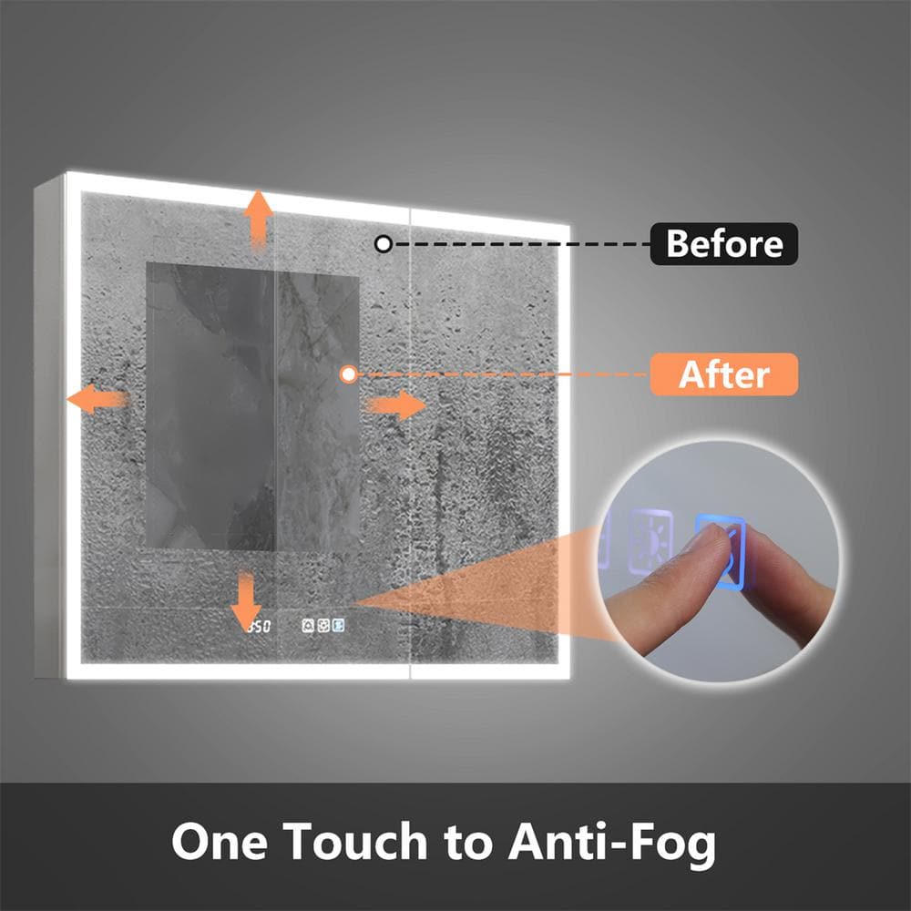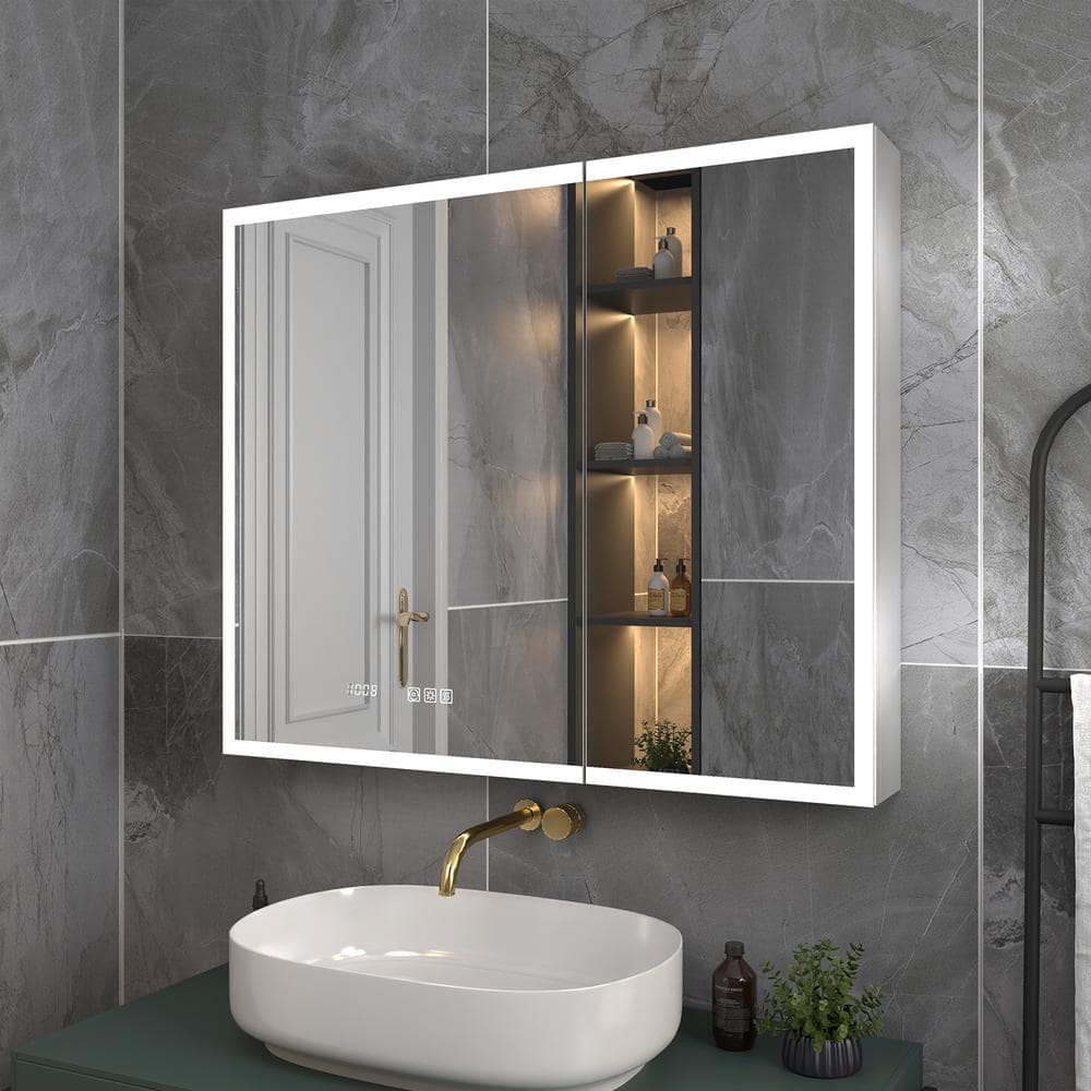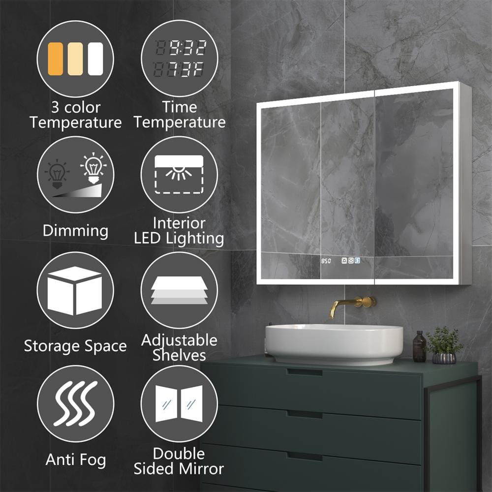 Upgrade your bathroom with the ExBrite 36-inch Medicine Cabinet. This sleek silver aluminum cabinet combines modern technology with elegant design, featuring an integrated dimmable LED light, a built-in clock, and a defogger for ultimate convenience. With dual-swing mirrored doors and sensor-activated lighting, it offers ample storage while adding a sophisticated touch to any bathroom.