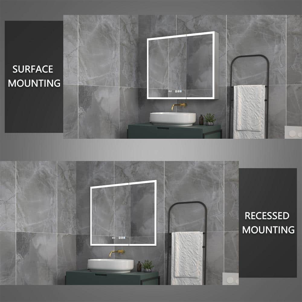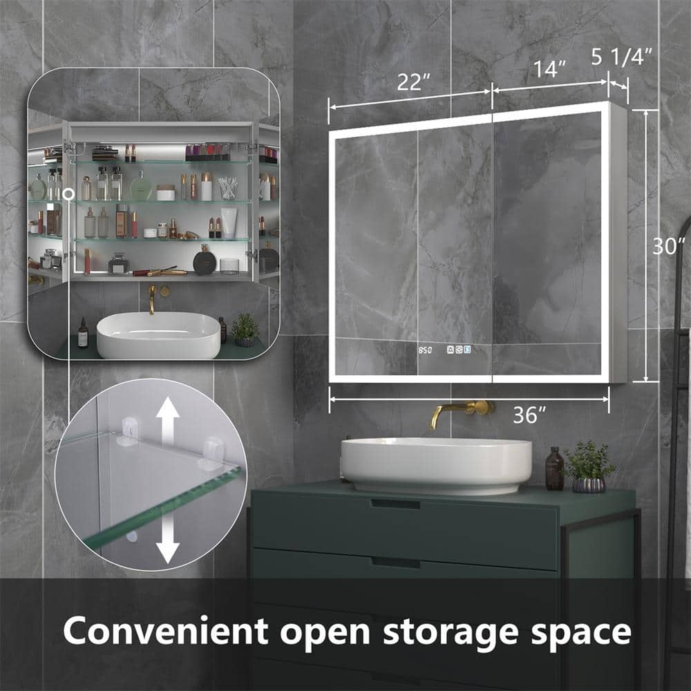 ExBrite 36 in. W x 30 in. H Rectangular Silver Aluminum Recessed/Surface Mount Medicine Cabinet with Mirror, LED and Clock