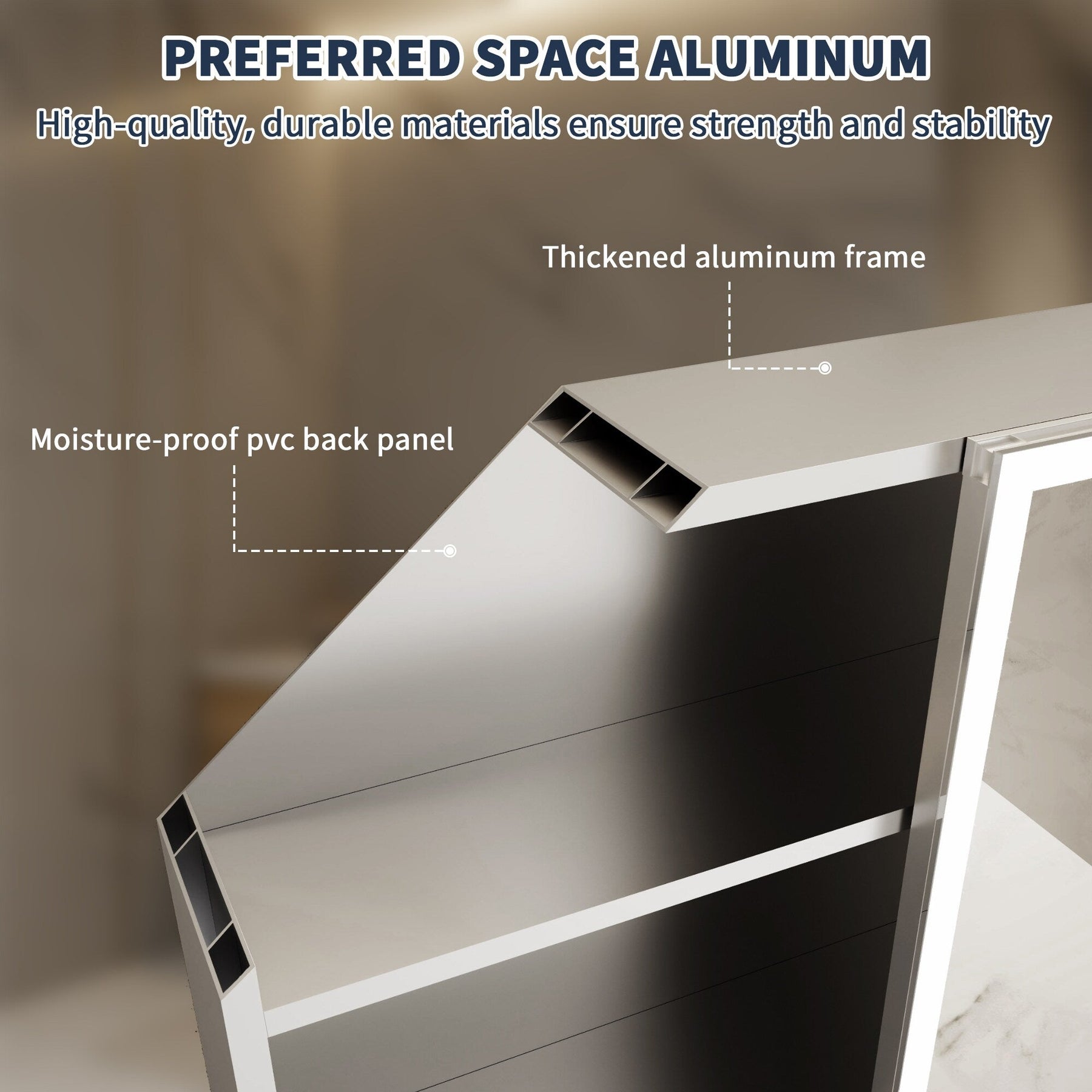 A: The ExBrite cabinet is constructed from durable aluminum with a sleek silver finish, designed to withstand bathroom humidity and maintain its modern aesthetic.