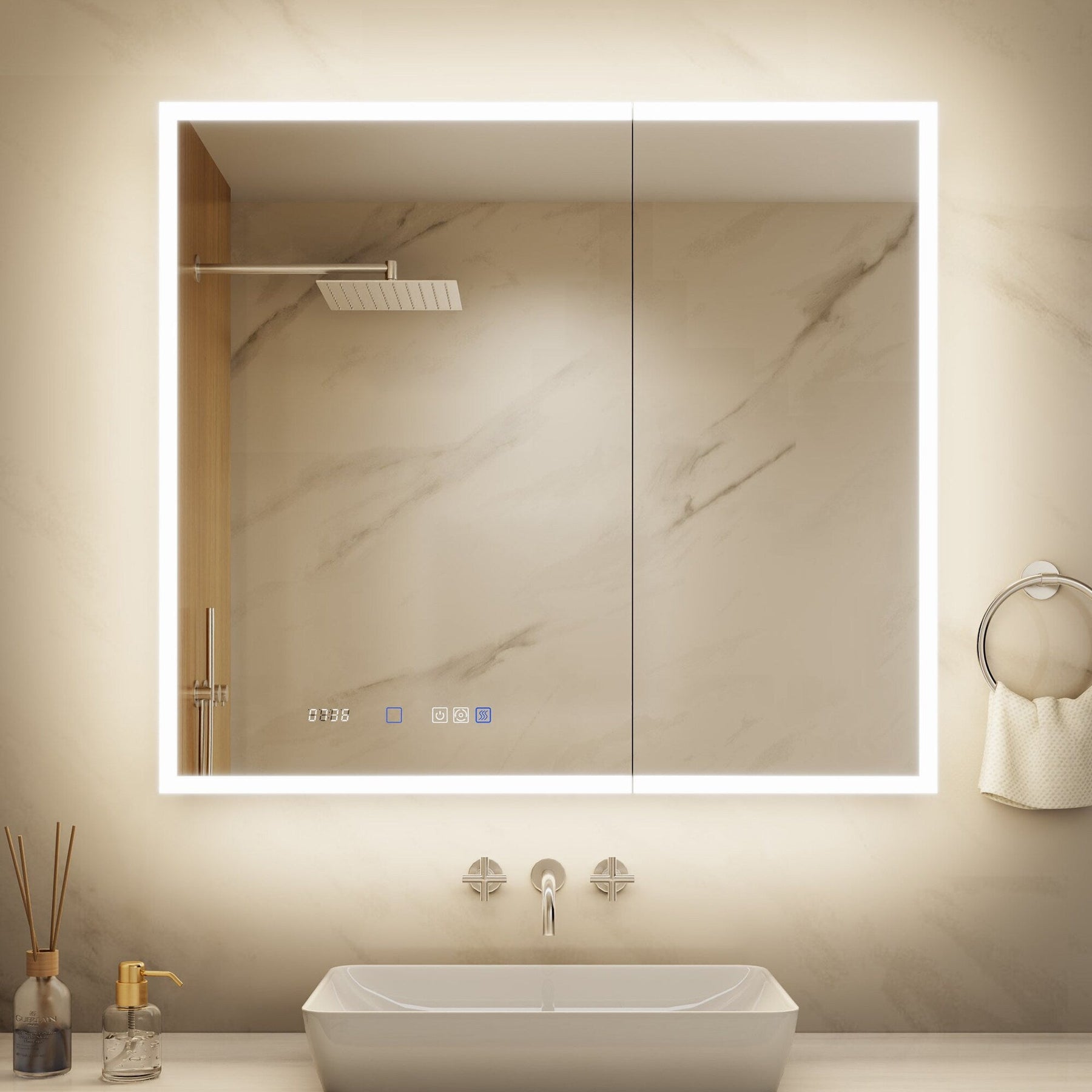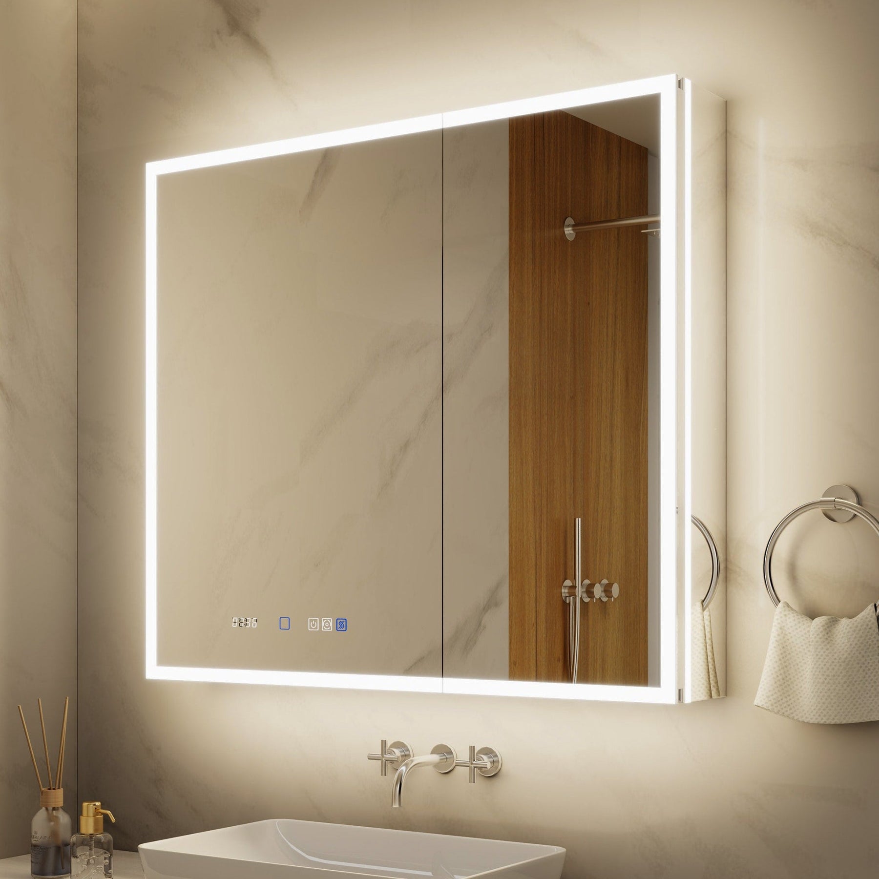 A: Yes, the cabinet features a clock and temperature display to keep you updated easily. This display is part of the touch-controlled interface for user convenience.