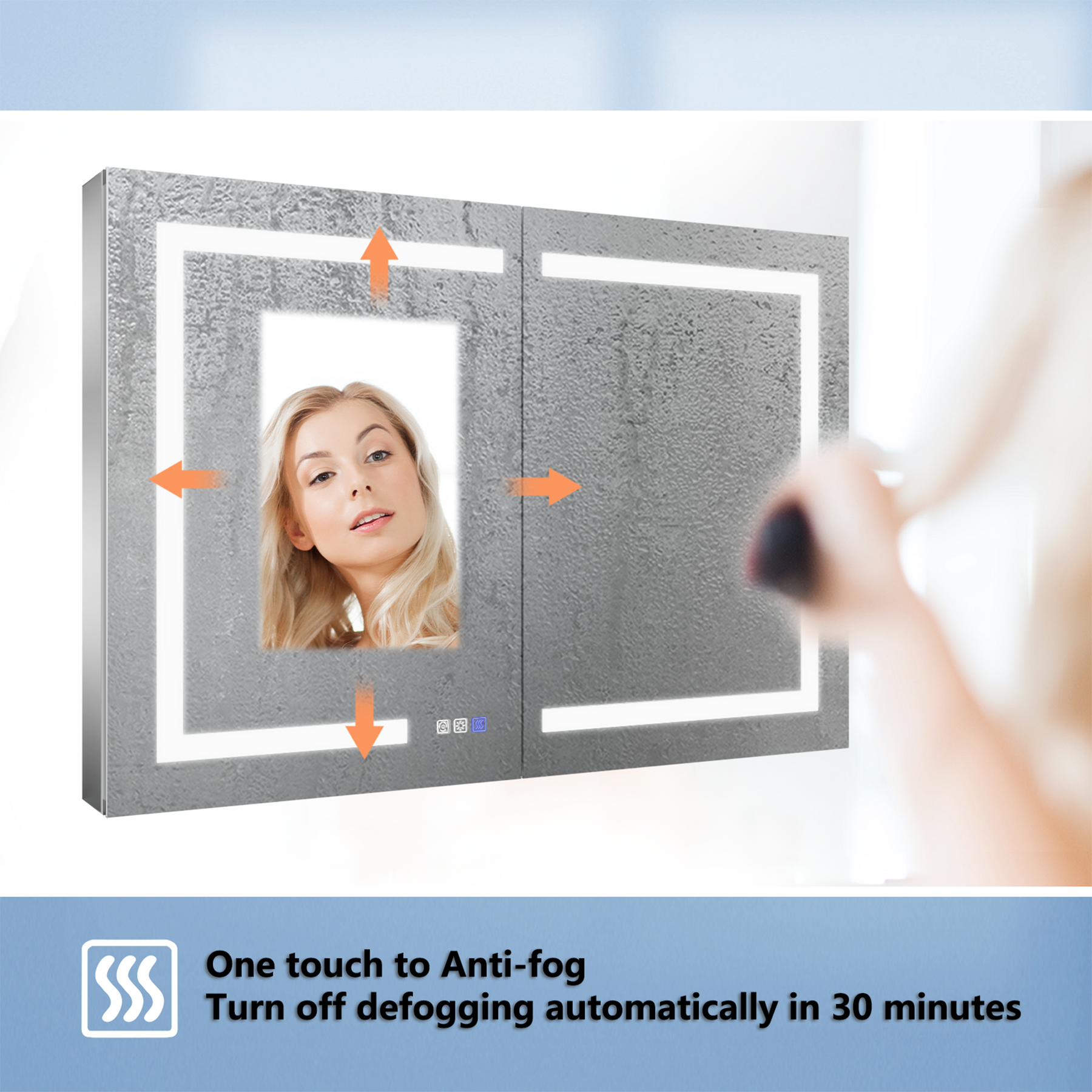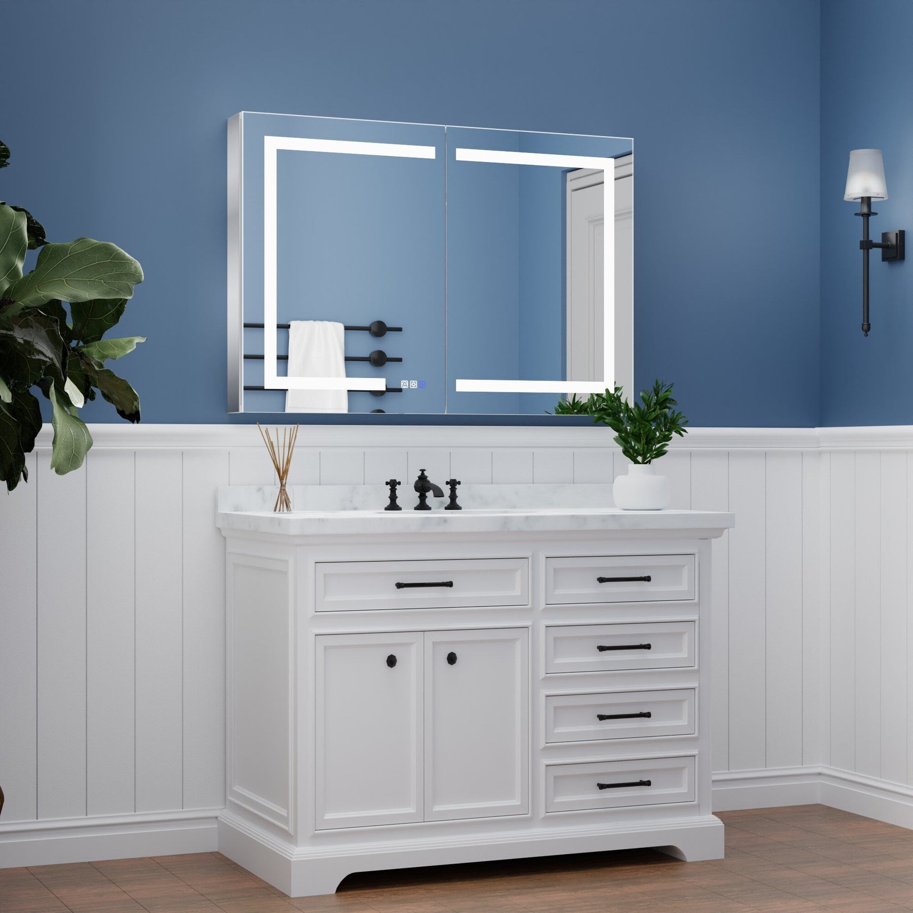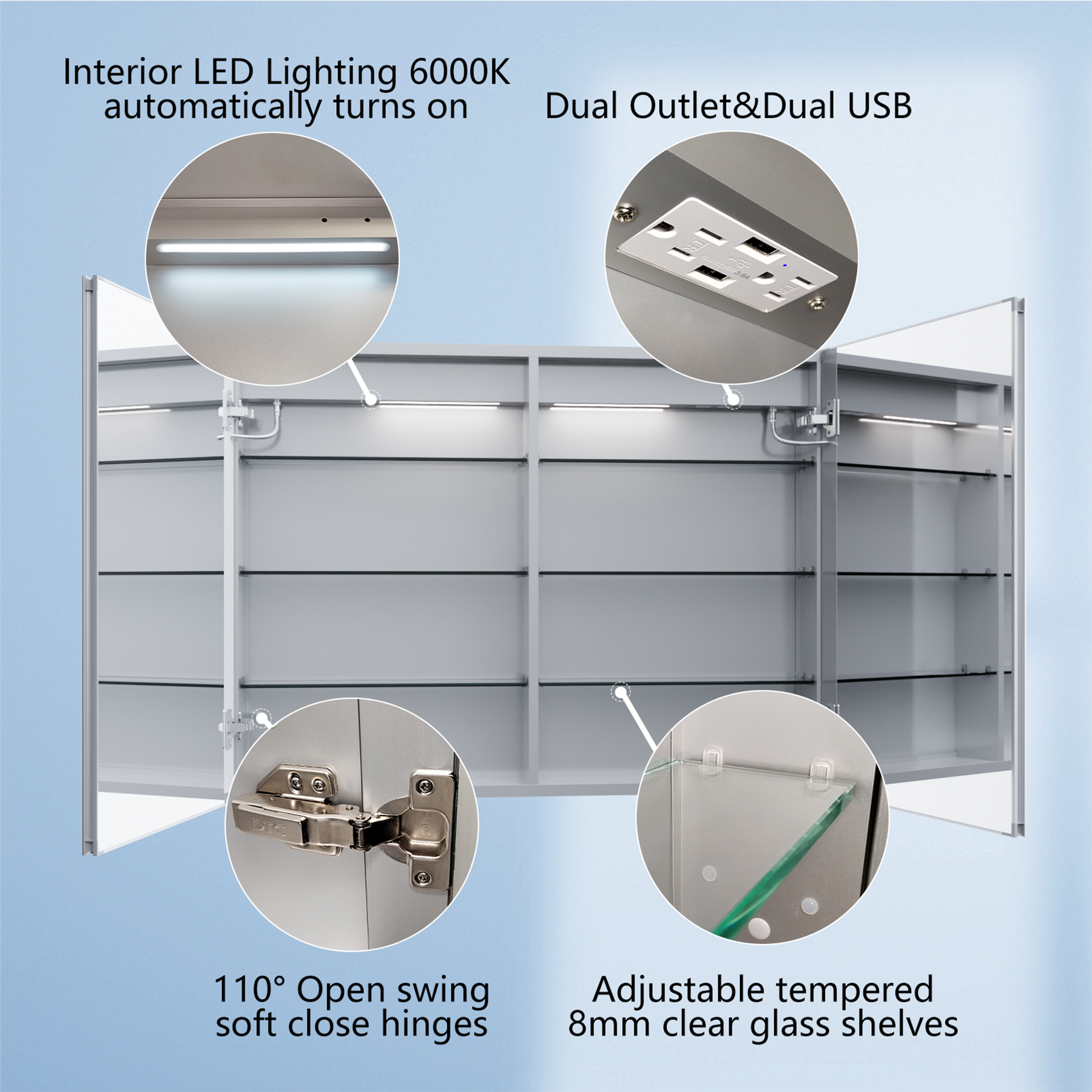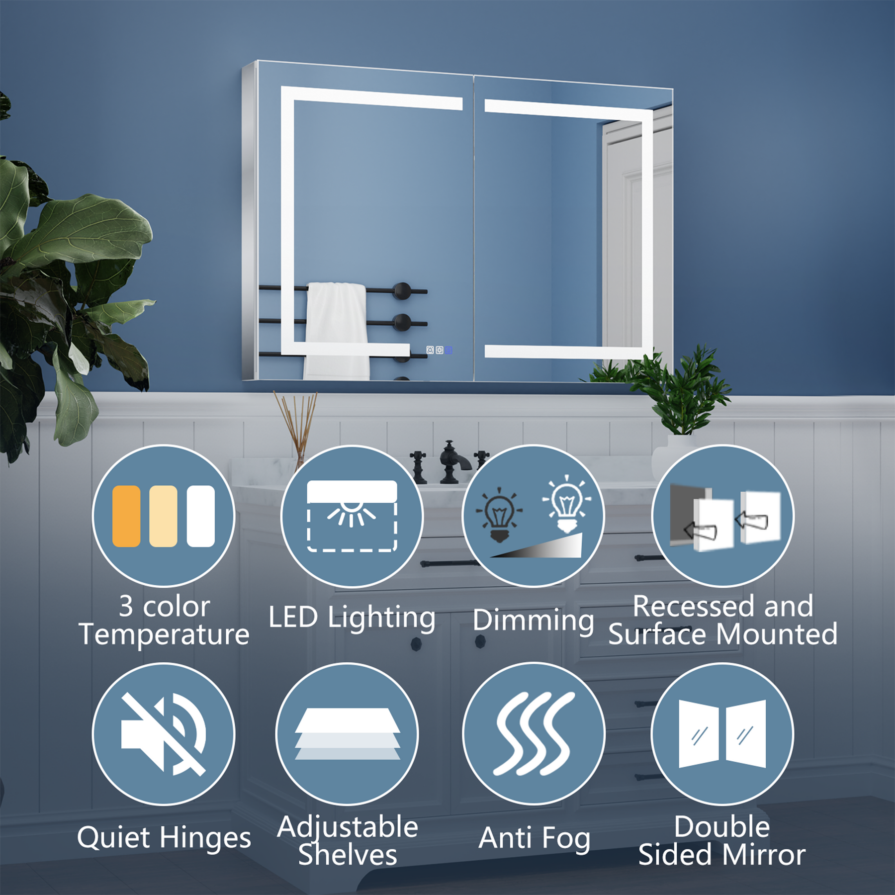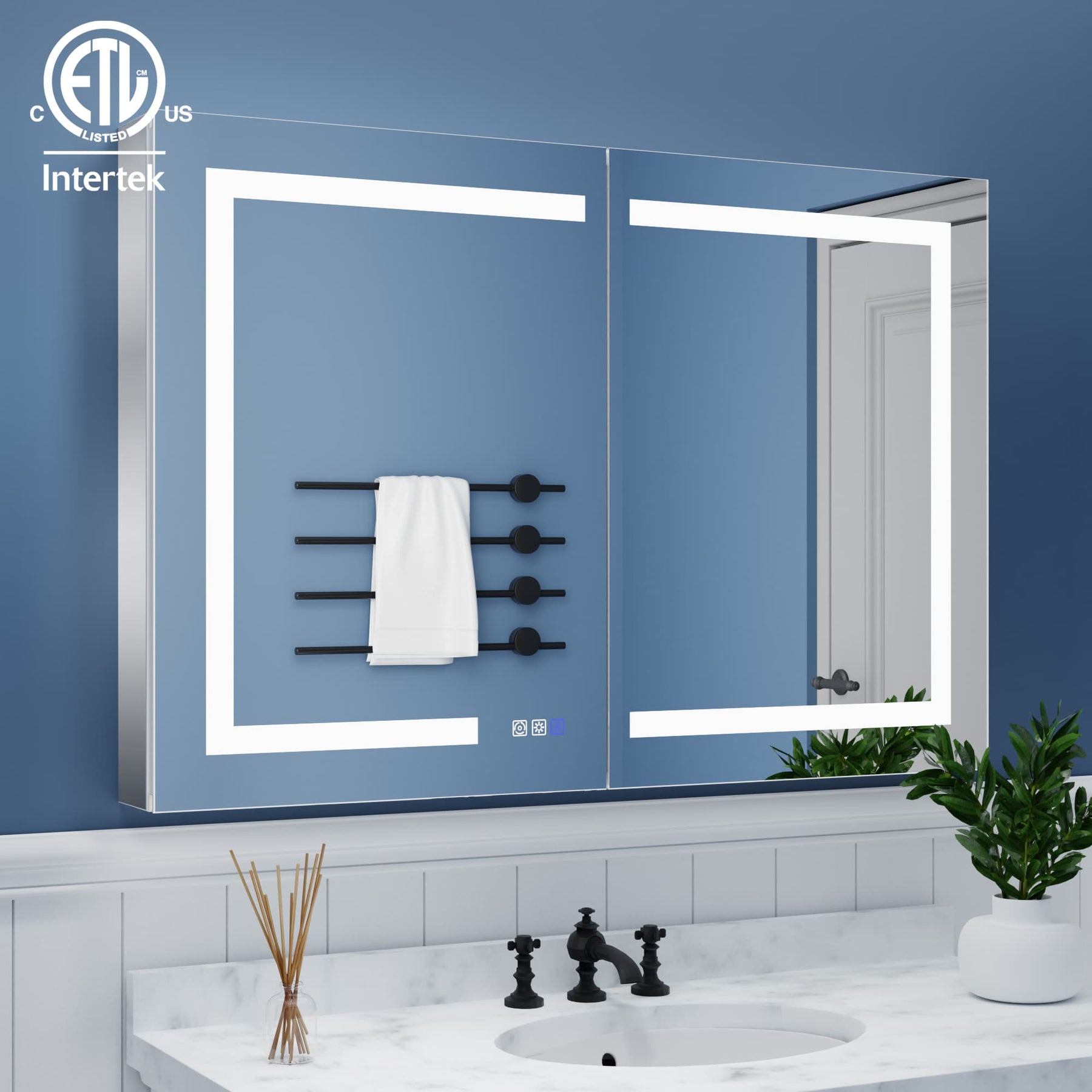 ExBrite 44-in x 30-in Lighted LED Fog Free Surface/Recessed Mount Silver Mirrored Soft Close Medicine Cabinet with Outlet
