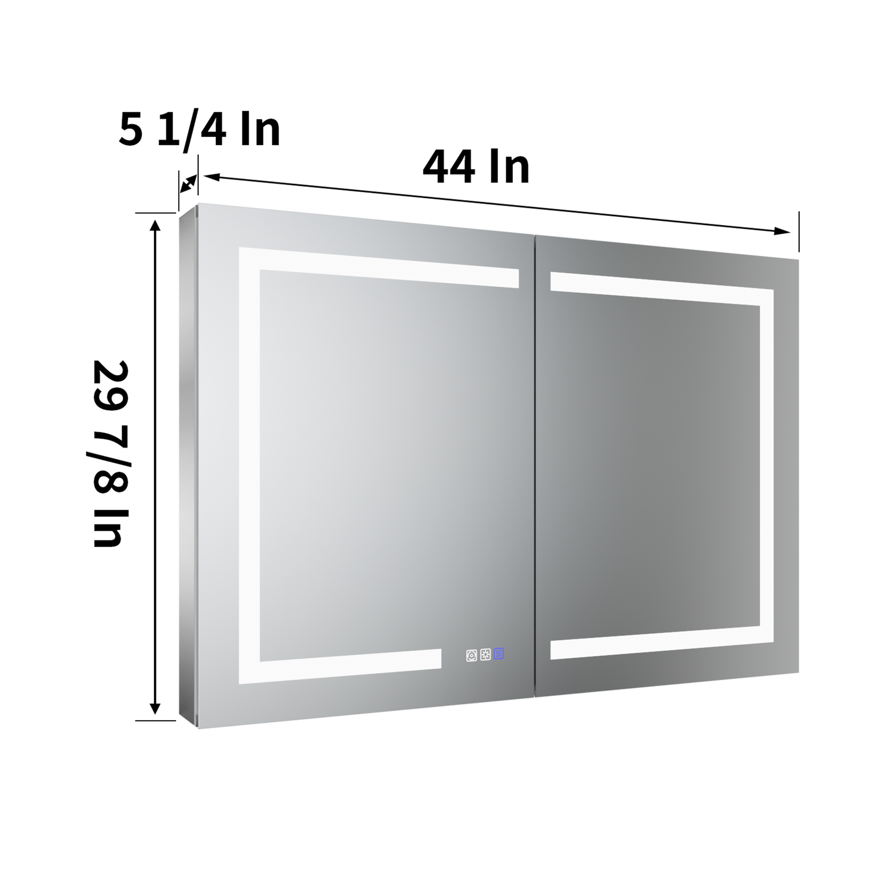 The ExBrite Lighted LED Fog-Free Medicine Cabinet blends style and functionality in a sleek, sophisticated design. This 44-inch by 30-inch cabinet features energy-saving LED lighting, an anti-fog mirror, and built-in outlets for added convenience, making it a must-have for modern bathrooms.