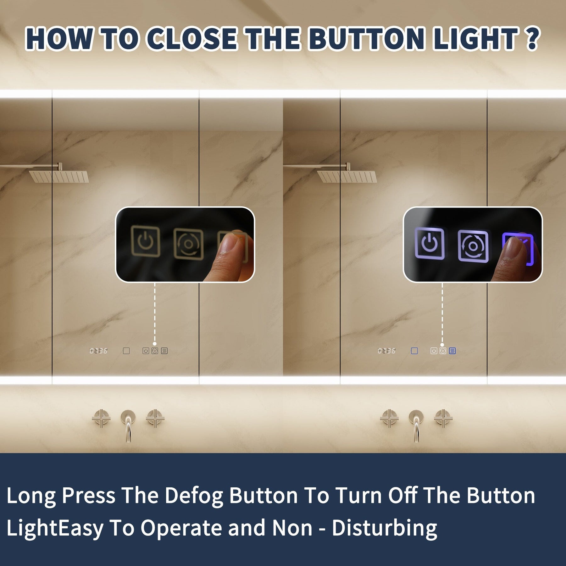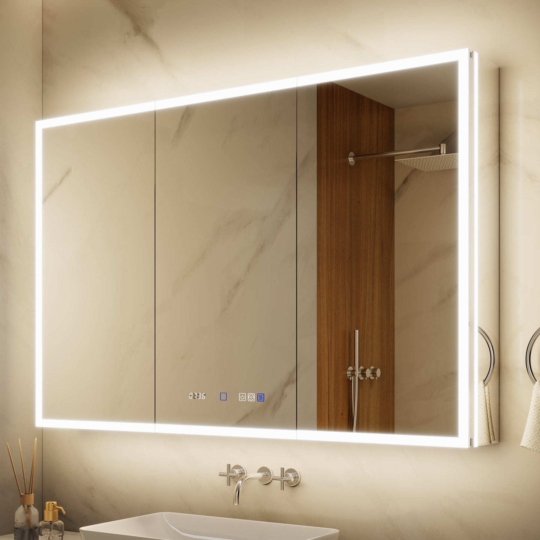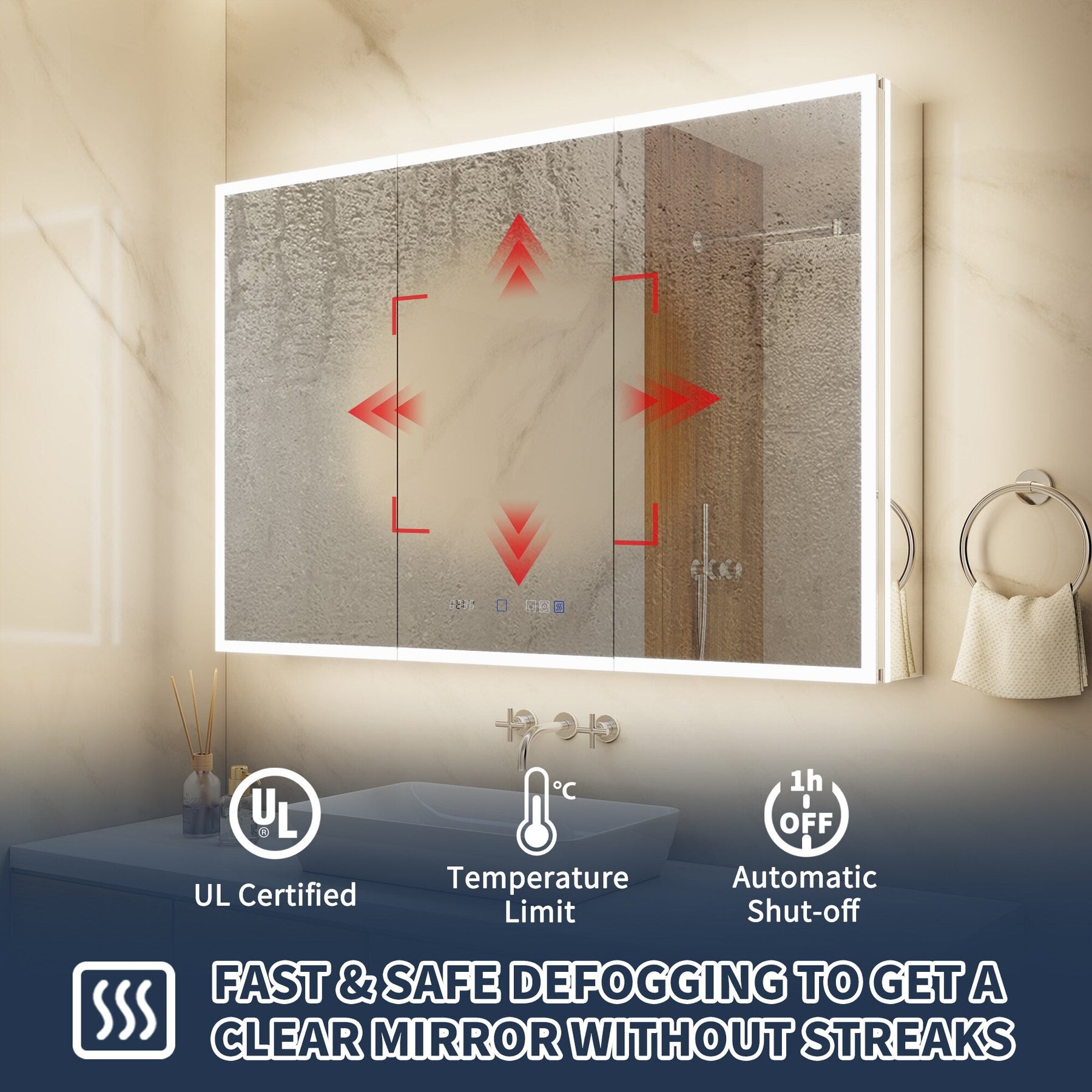 A: The cabinet includes an anti-fog function that activates with the light, preventing condensation buildup on the mirror surface after a hot shower.