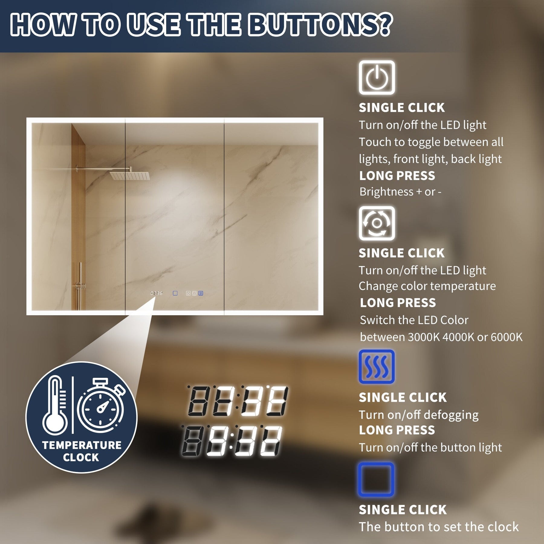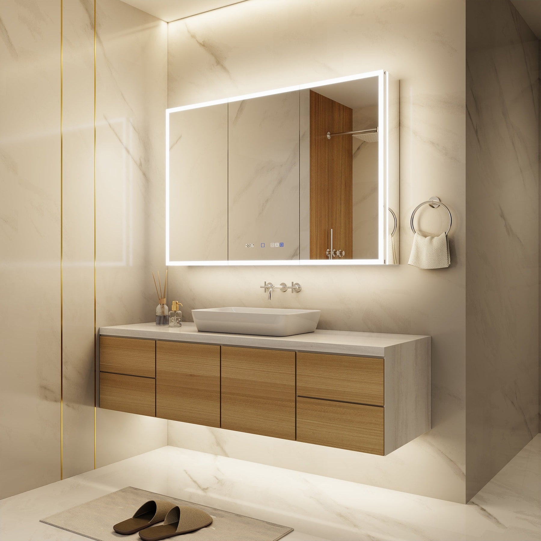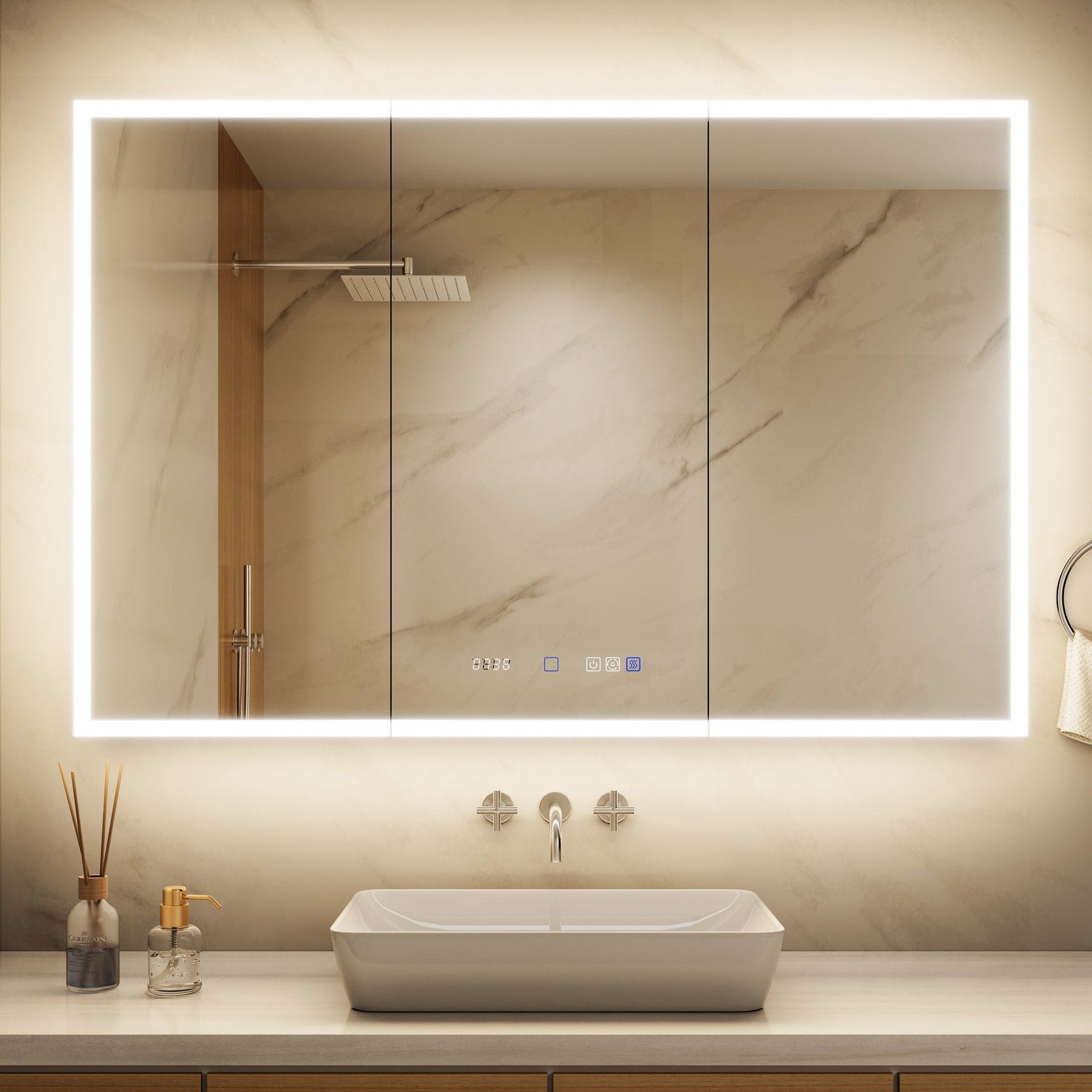 A: The cabinet includes an anti-fog function that activates with the light, preventing condensation buildup on the mirror surface after a hot shower.