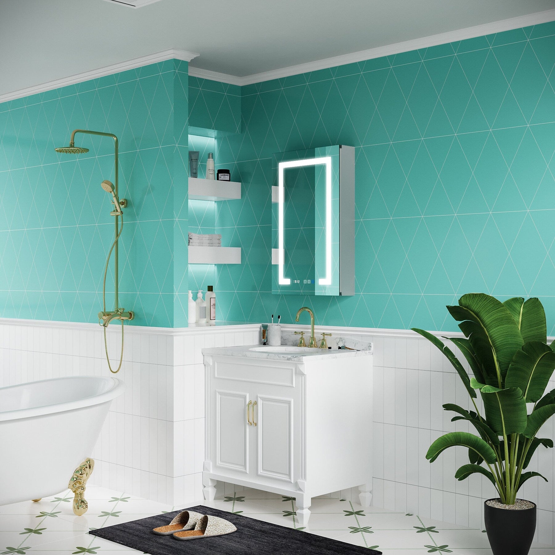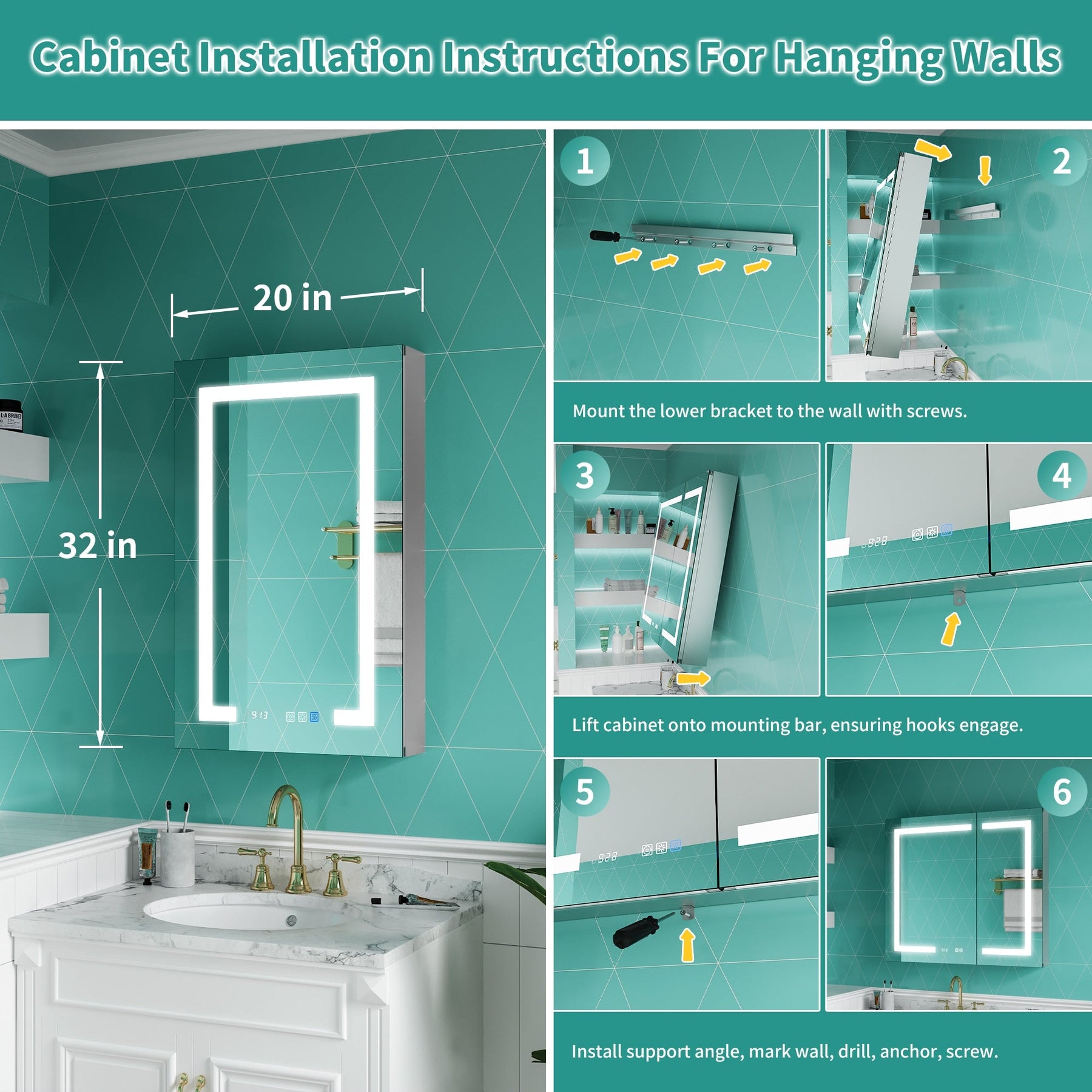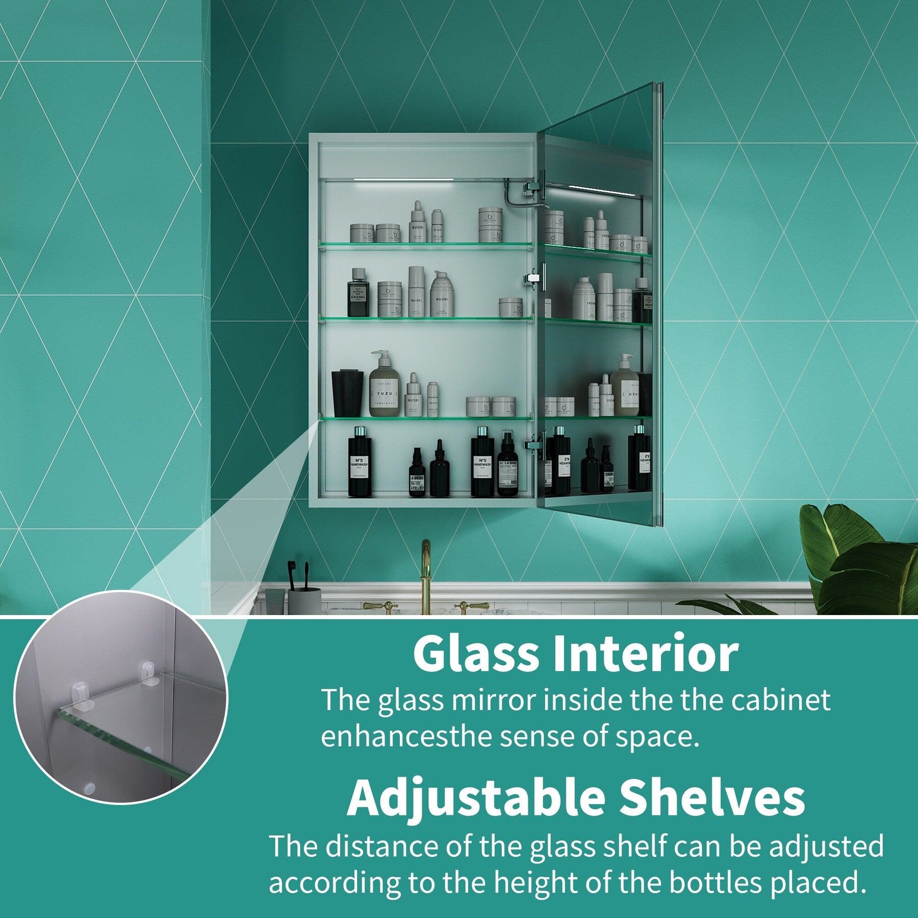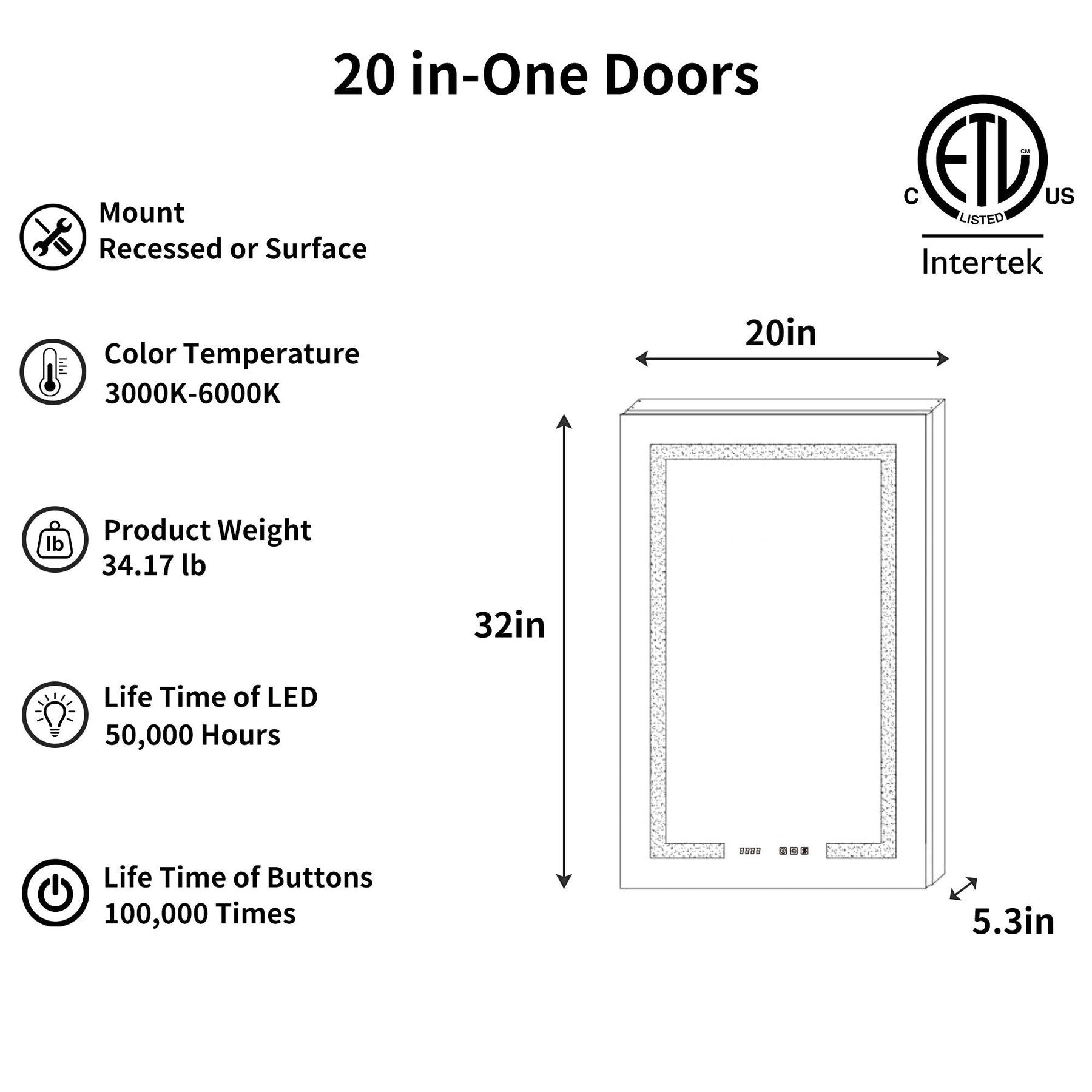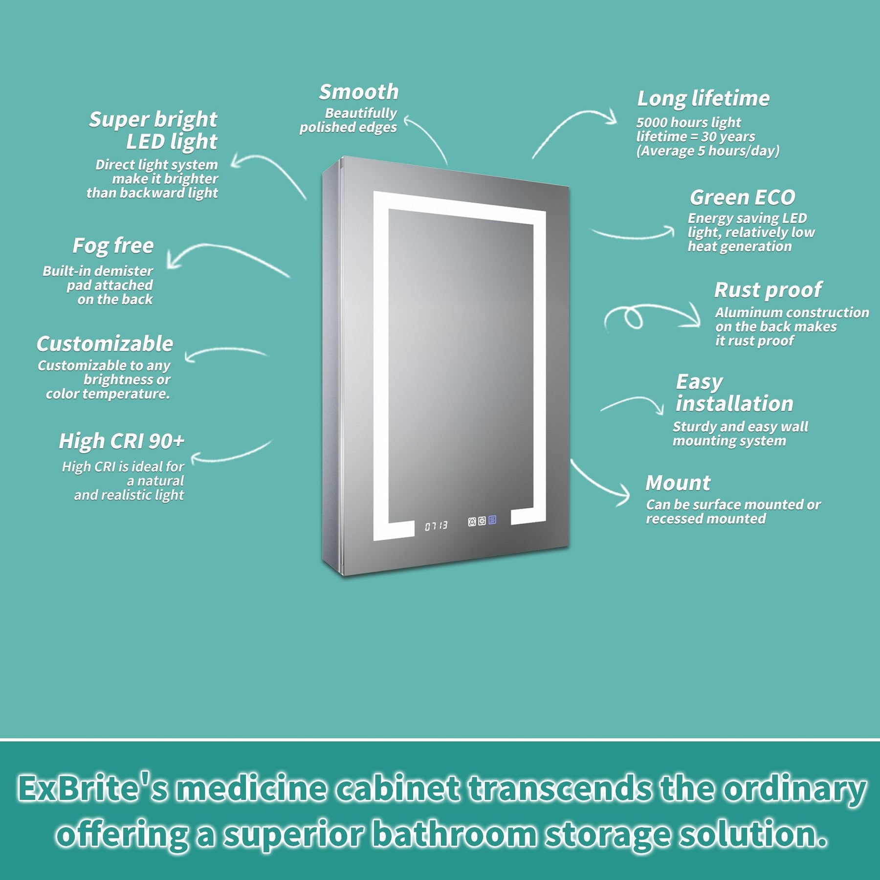 The ExBrite Ethos LED Medicine Cabinet is a versatile, stylish solution for modern bathrooms. This 20 x 32-inch cabinet features advanced LED lighting, a fog-free mirror, and convenient features like a built-in outlet and adjustable shelves. Perfect for both surface and recessed mounting, it's designed to enhance functionality and aesthetic appeal.
