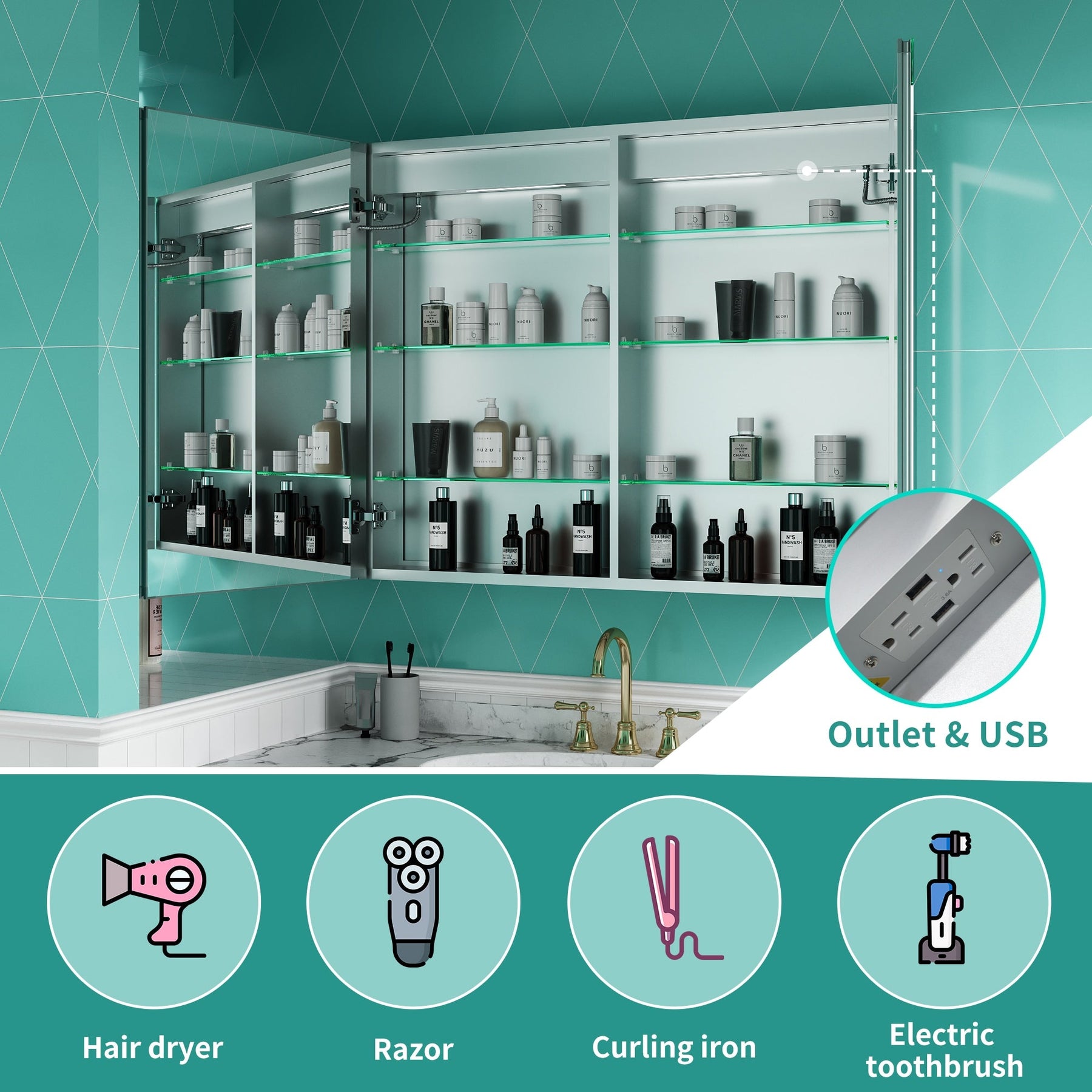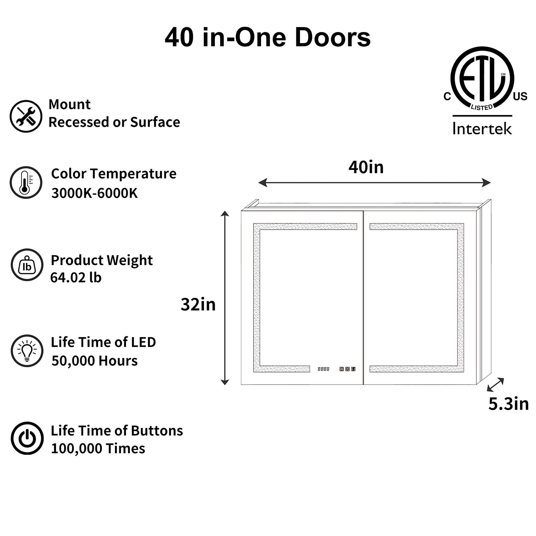 ExBrite Ethos 40-in x 32-in Lighted LED Fog Free Surface/Recessed Mount Silver Mirrored Soft Close Medicine Cabinet with Outlet