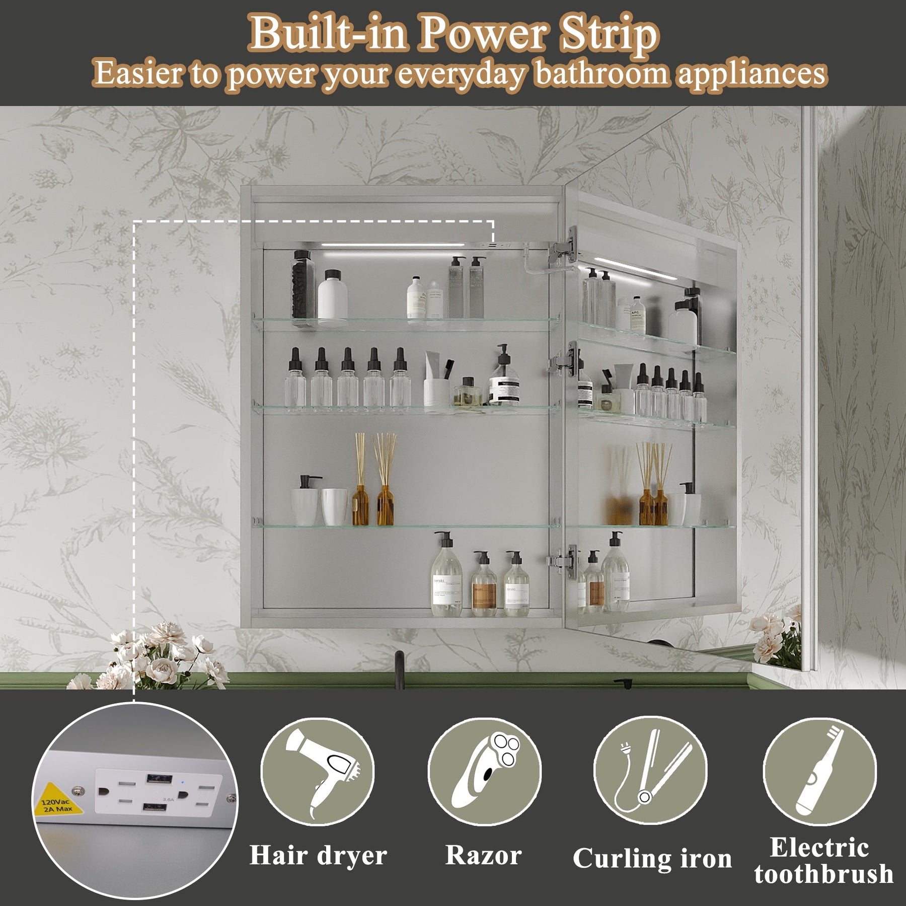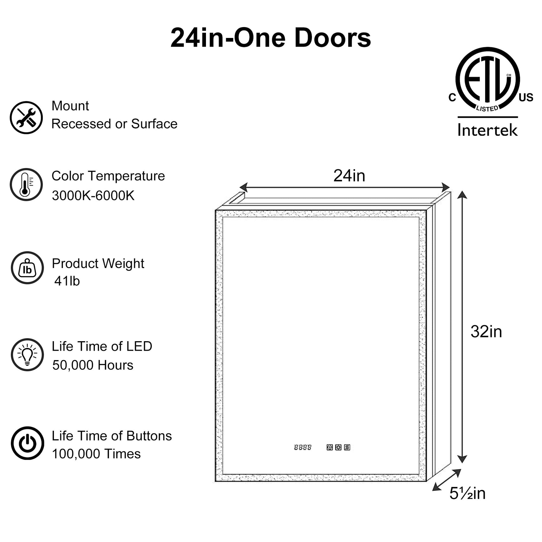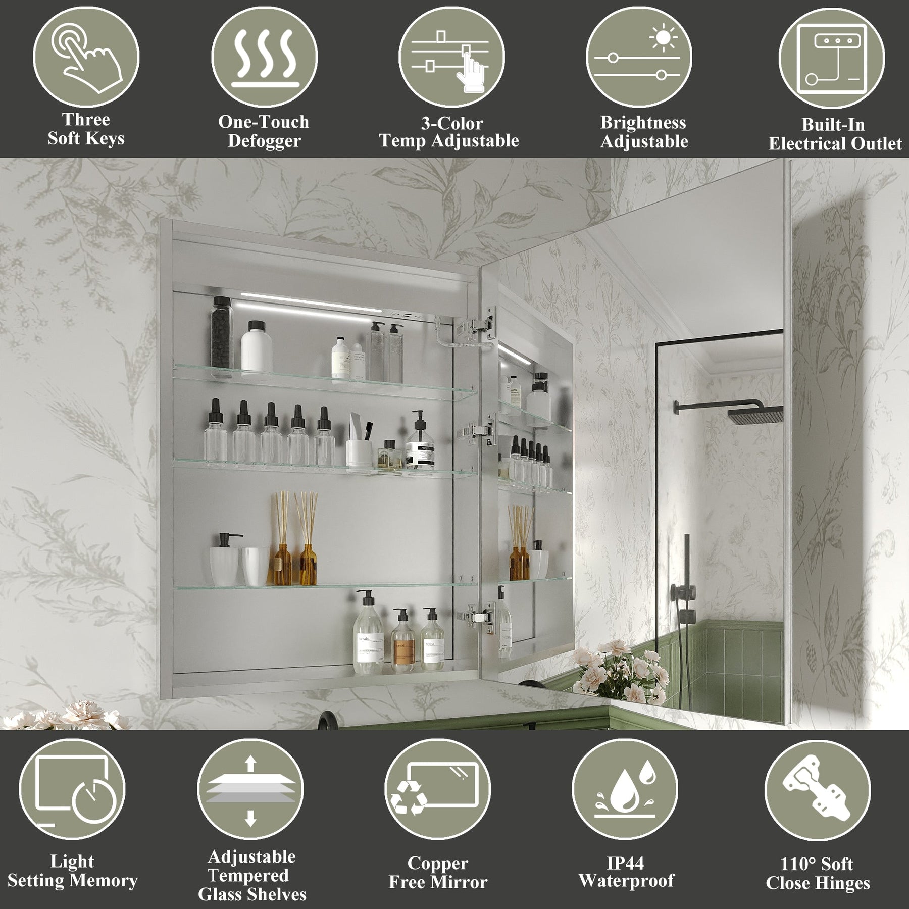 ExBrite Luvia 24-in x 32-in Lighted LED Fog Free Surface/Recessed Mount Silver Mirrored Soft Close Medicine Cabinet with Outlet