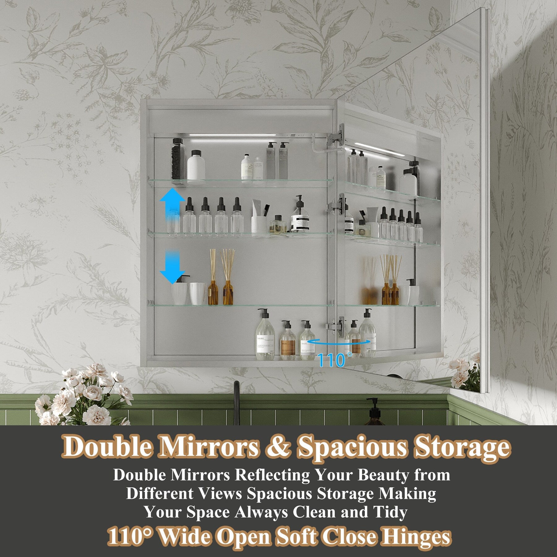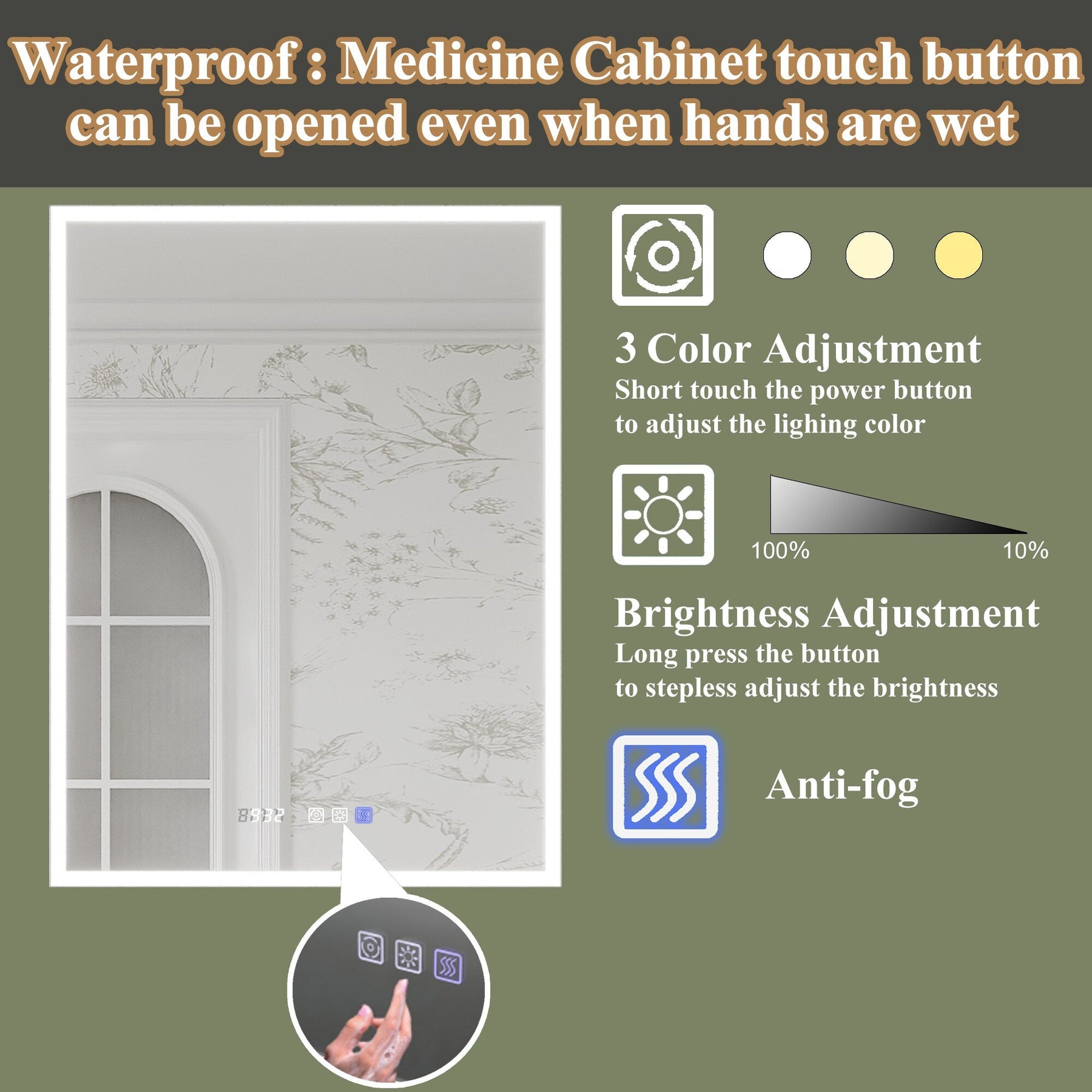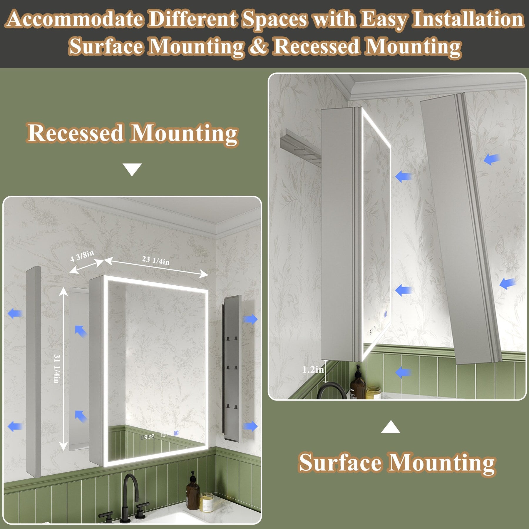 ExBrite Luvia 24-in x 32-in Lighted LED Fog Free Surface/Recessed Mount Silver Mirrored Soft Close Medicine Cabinet with Outlet