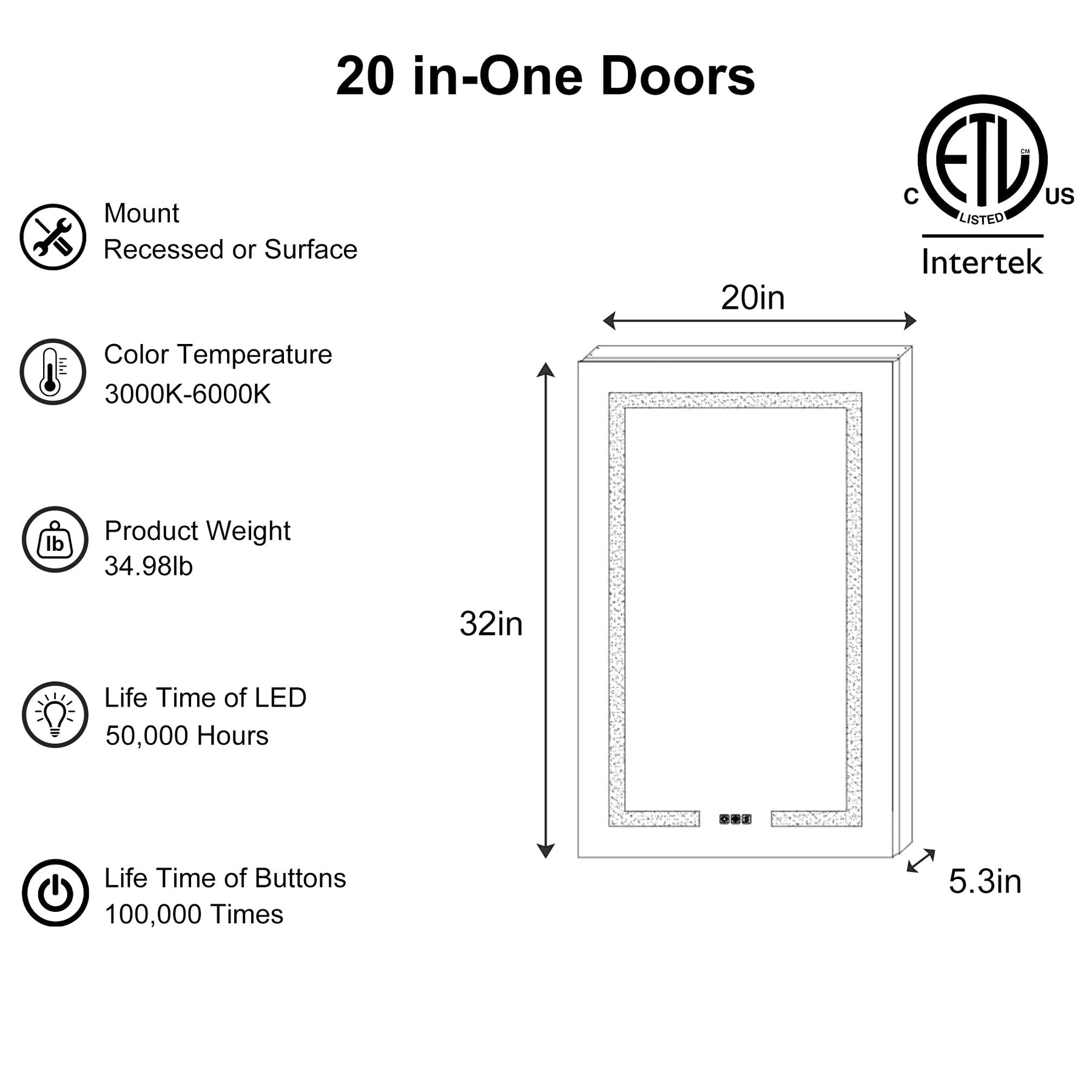 ExBrite Opale 20-in x 32-in Lighted LED Fog Free Surface/Recessed Mount Silver- 32"h- Left Mirrored Soft Close Medicine Cabinet with Outlet