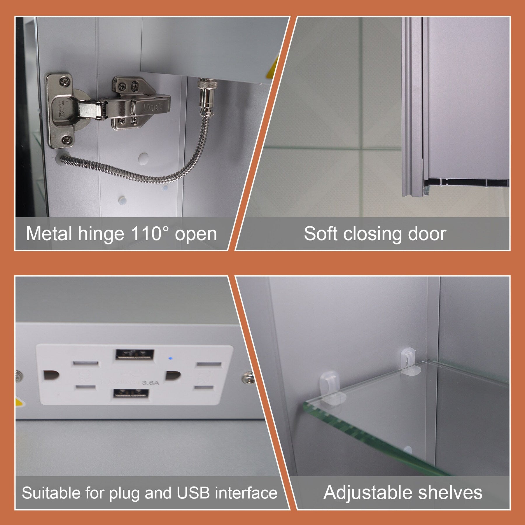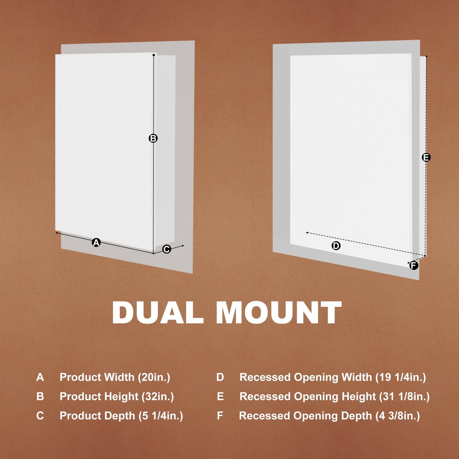 ExBrite Opale 20-in x 32-in Lighted LED Fog Free Surface/Recessed Mount Silver- 32"h- Right Mirrored Soft Close Medicine Cabinet with Outlet