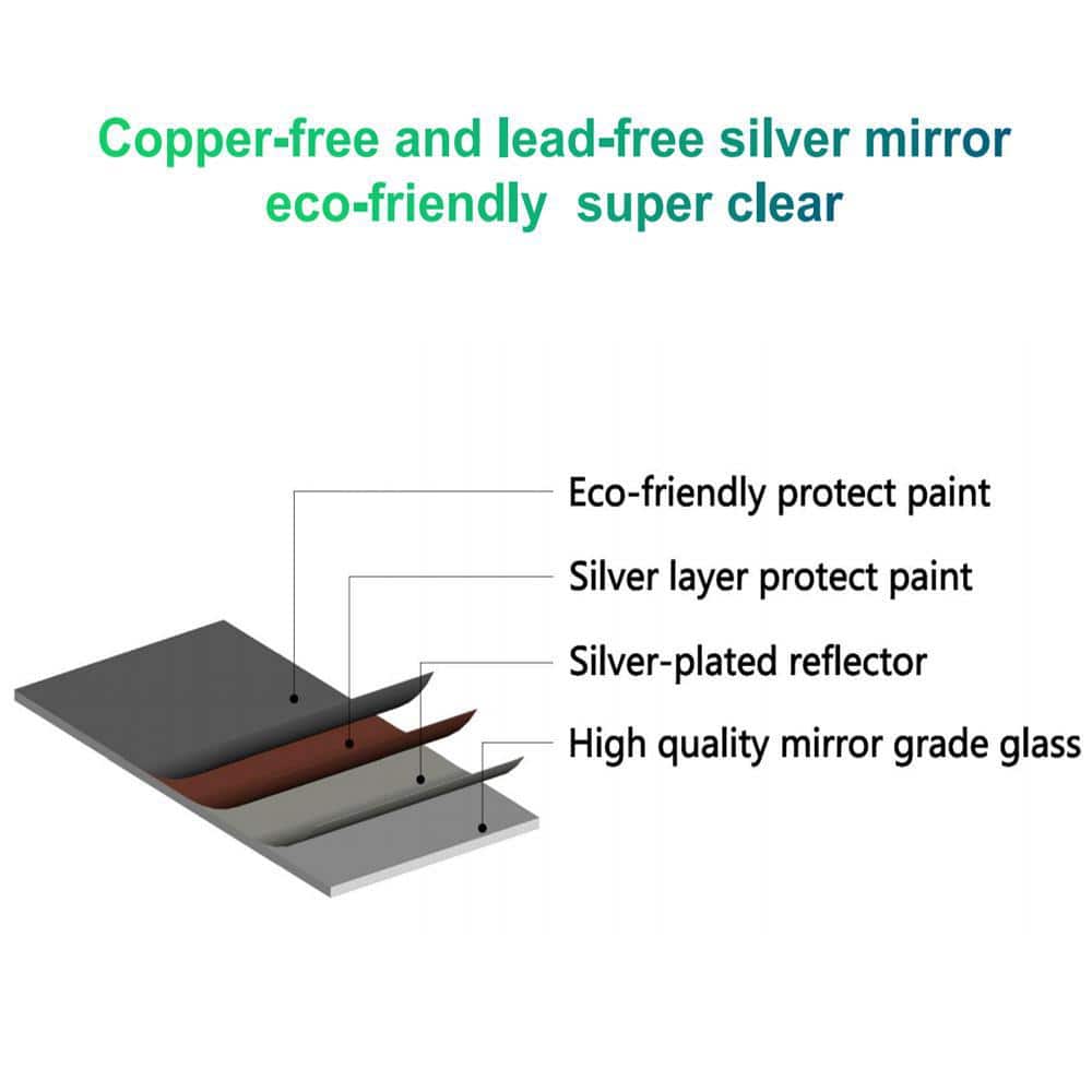 A: The mirror features a durable copper-free silver construction, which is strong and eco-friendly, though not officially shatterproof.
