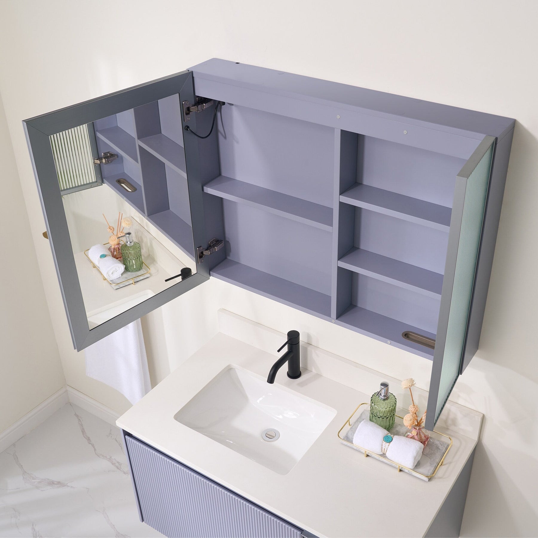 Transform your bathroom into a sanctuary of light and tranquility with this lavender-hued mirrored cabinet. Its soft-close doors and customizable LED lighting conjure a serene and harmonious ambiance, perfect for the modern lifestyle. The elegant fluted glass and sustainable wood design make for a stunning focal point above your vanity. Embrace luxury with eco-conscious design that's not just a cabinet, but an experience in elevated living.