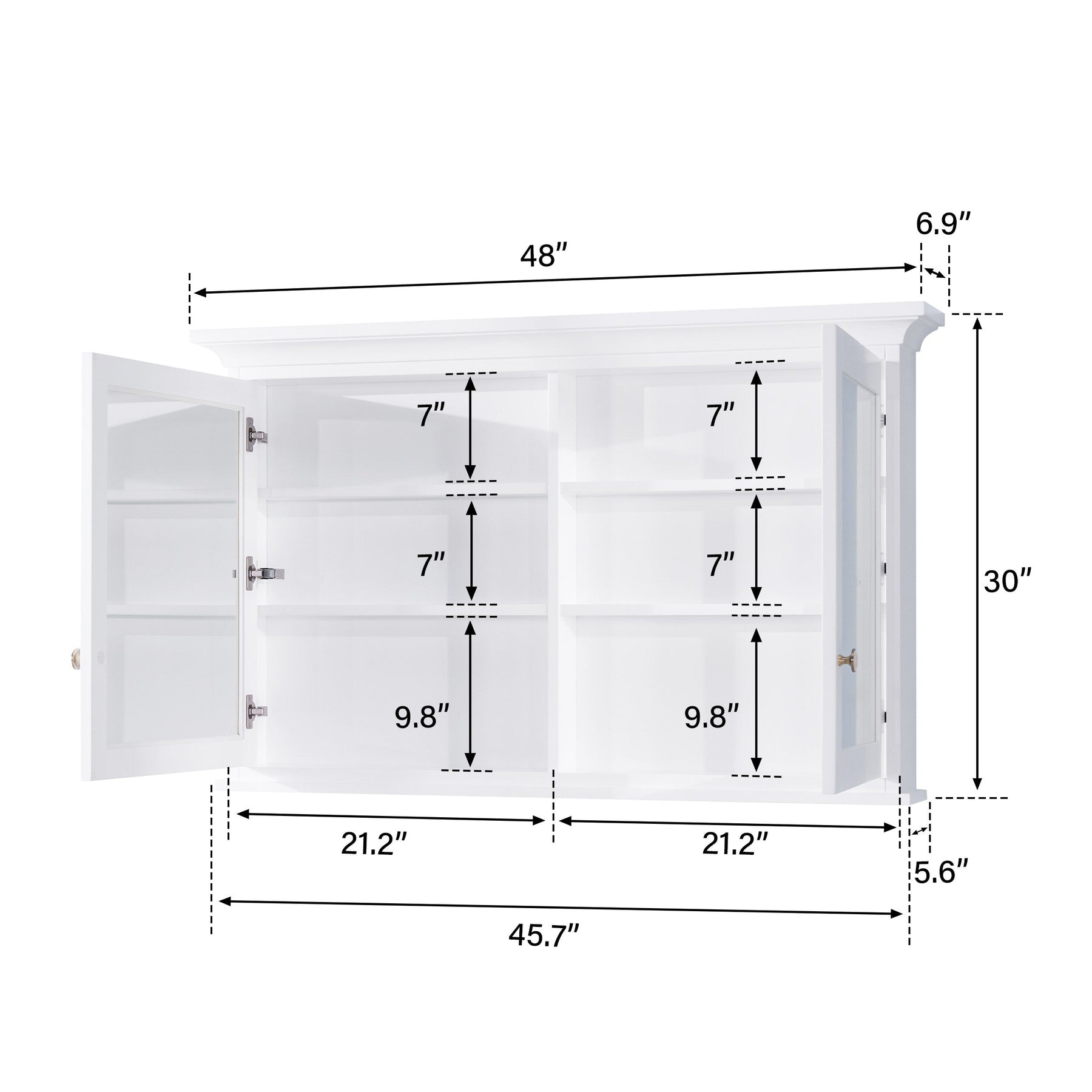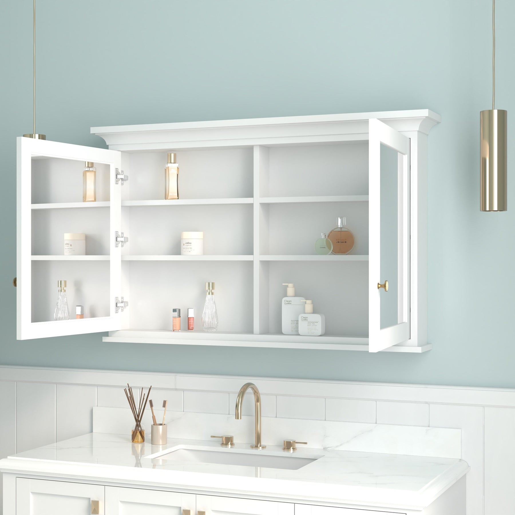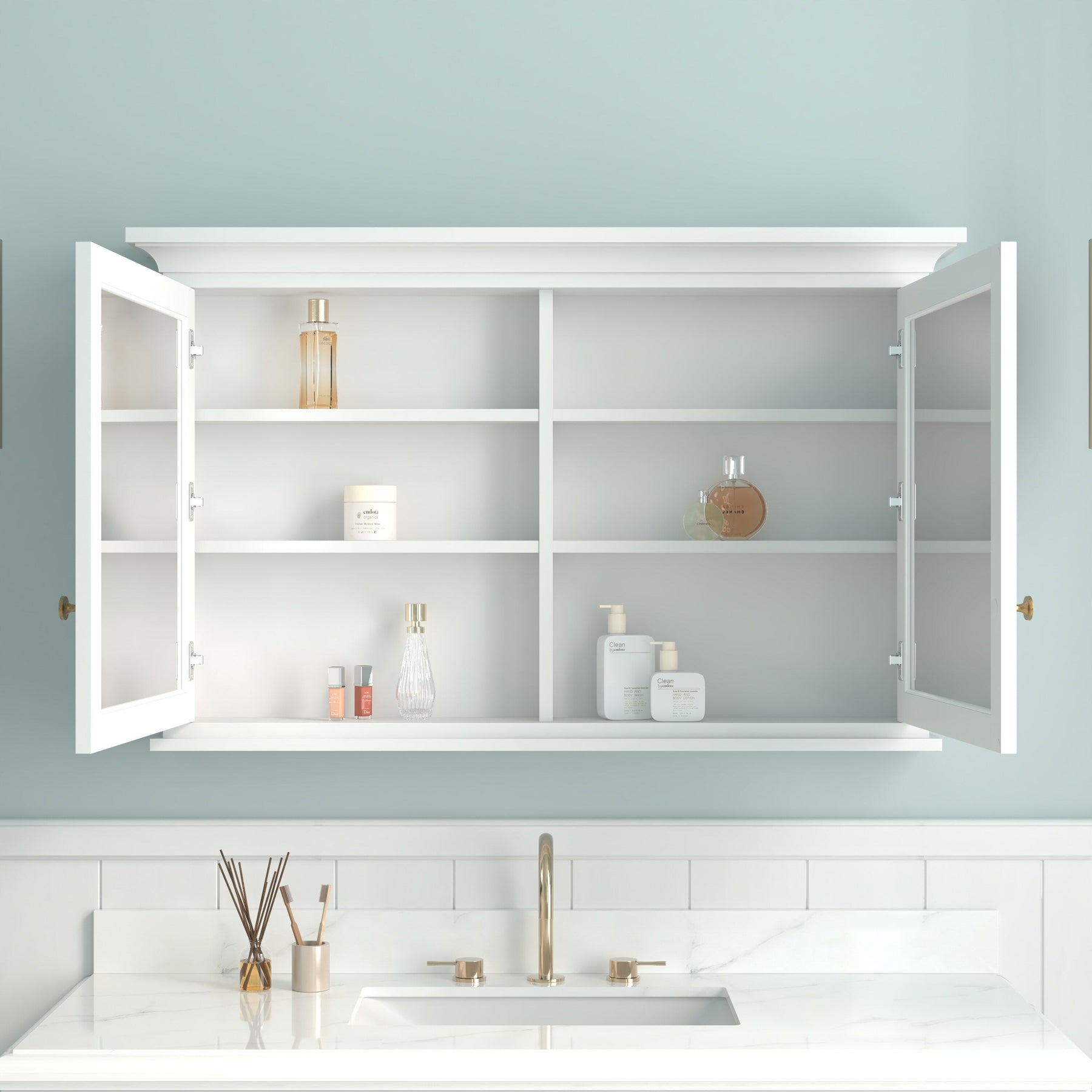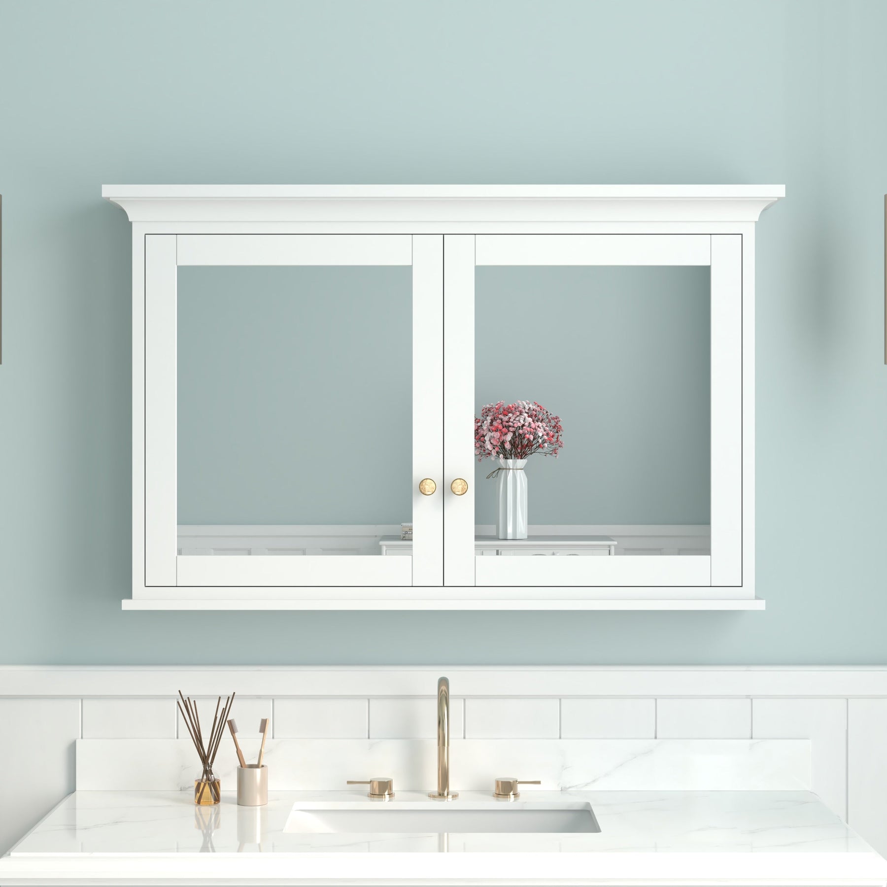 • Dual Soft-Close Doors: High-definition mirrored doors ensure quiet and smooth operation