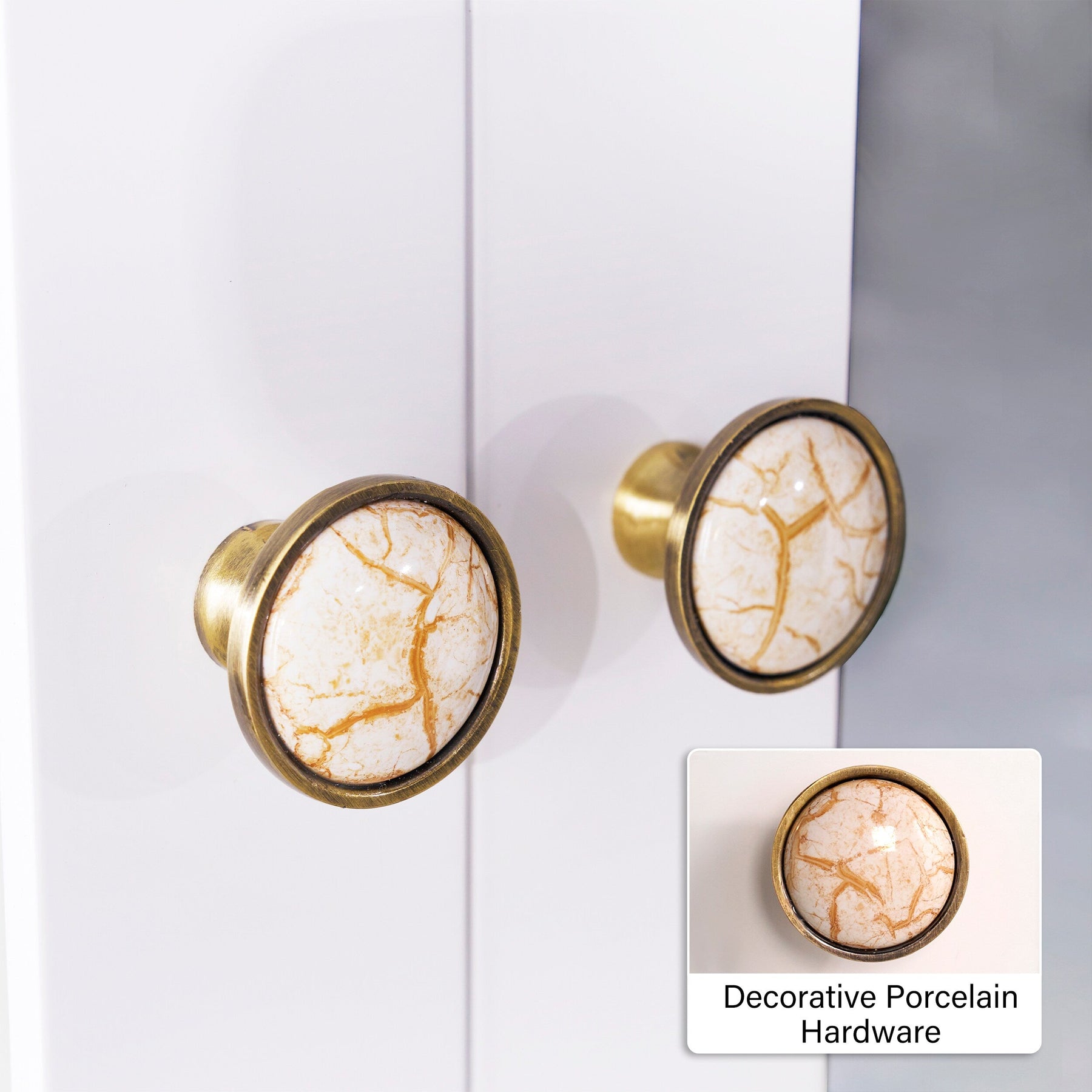 • Elegant Hardware: Decorative porcelain accents and metal alloy fixtures