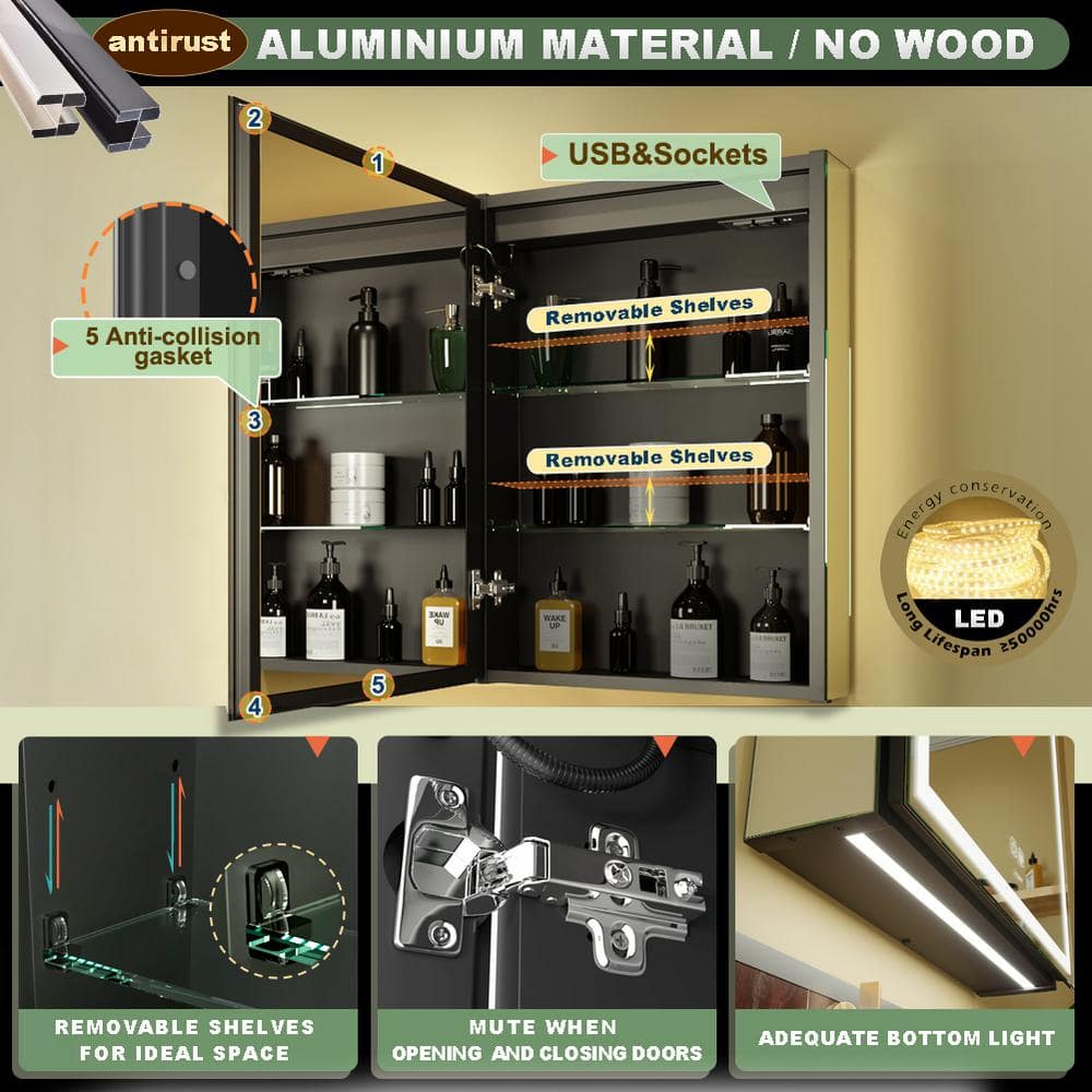 Enhance your space with the GANPE LED Lighted Medicine Cabinet, crafted from rust-resistant silver aluminum for resilient elegance. Featuring soft adjustable lighting and a dual-mirror design that offers convenience in personal grooming, this cabinet seamlessly integrates modern technology with functional storage solutions.