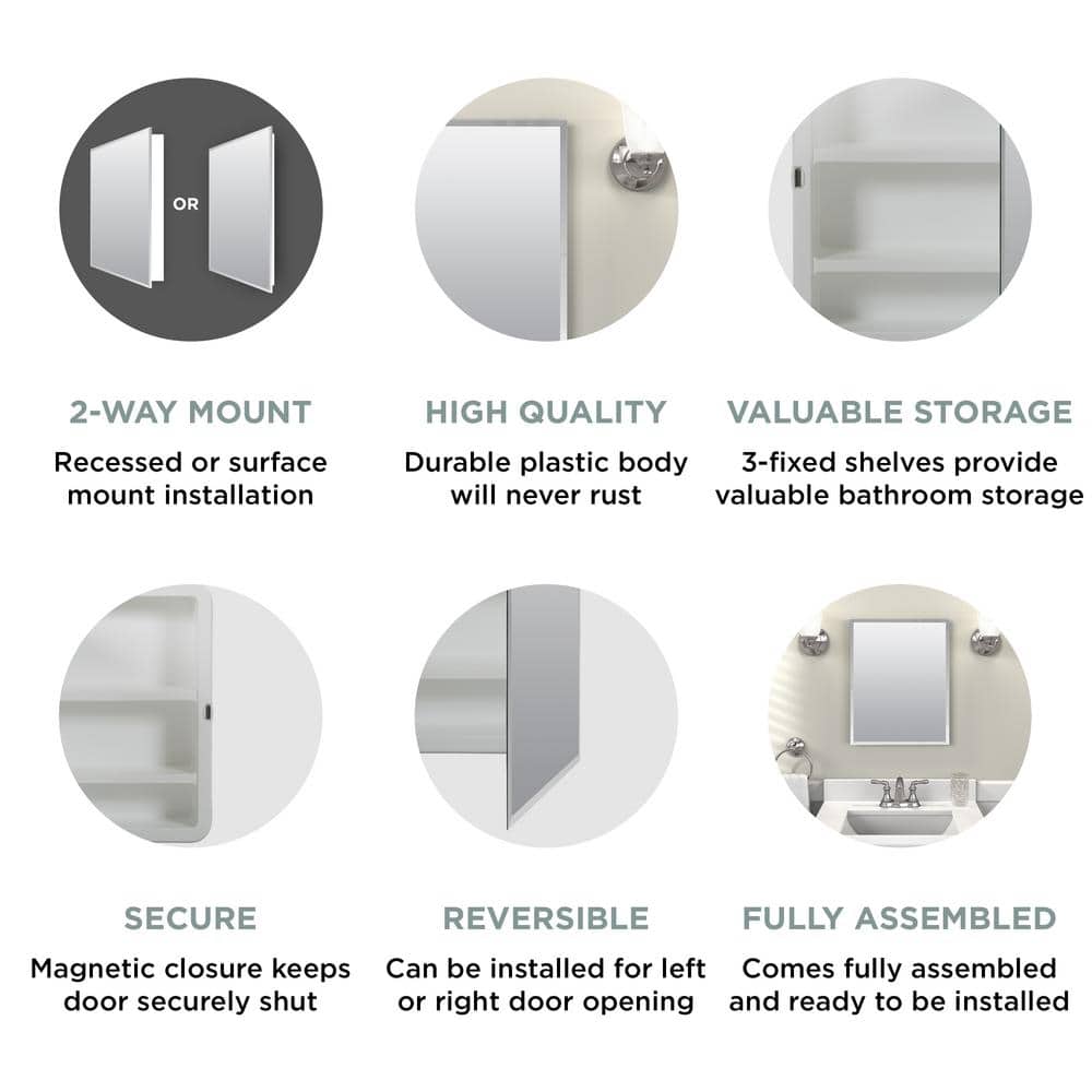 Upgrade your bathroom with the Glacier Bay Frameless Beveled Mirror Medicine Cabinet, offering a choice of sleek surface-mount or in-wall recessed installation. Its rust-resistant plastic body comes with three fixed shelves, perfect for storing your bath essentials in style. Ideal for compact spaces like powder rooms.