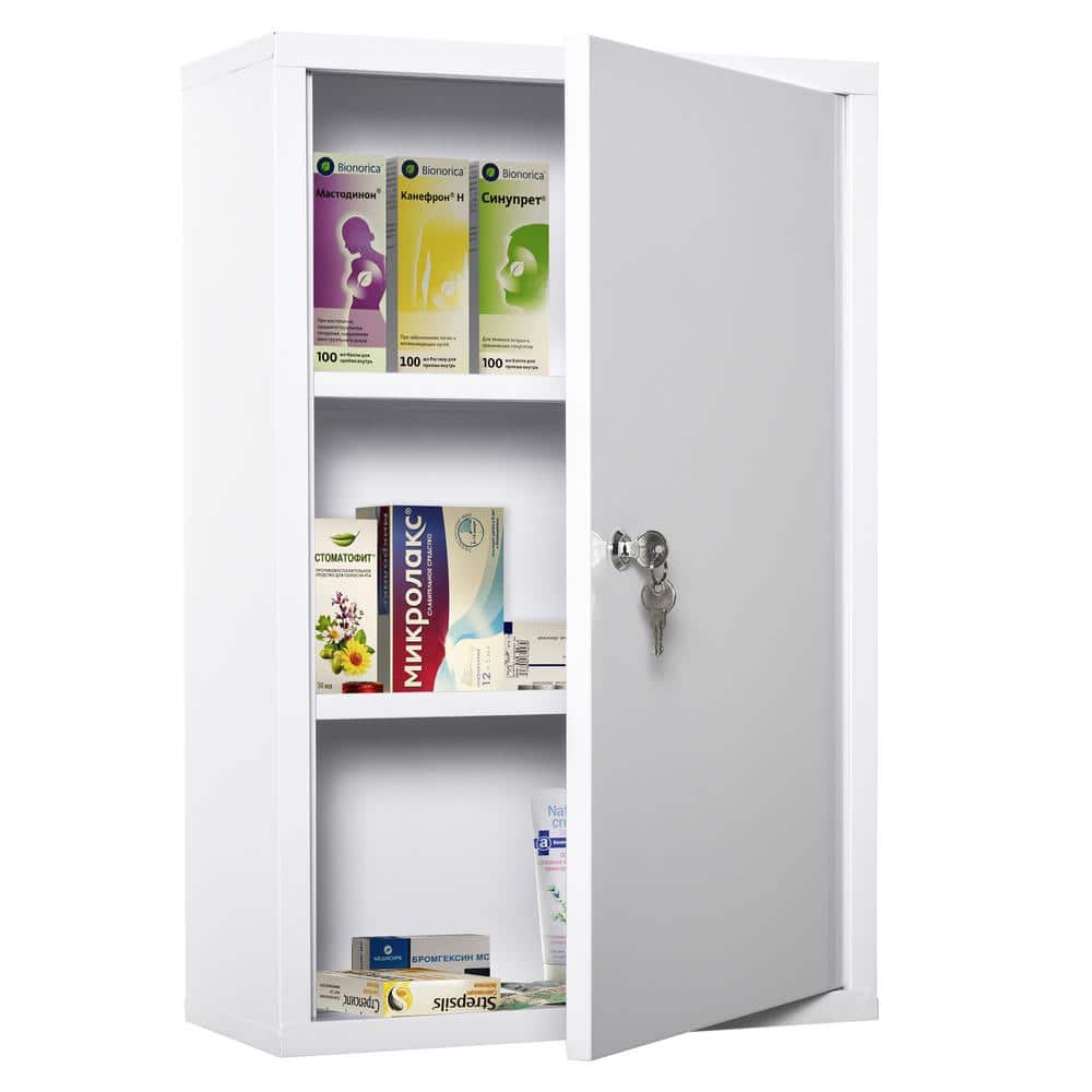 A: The cabinet includes three-tier shelves, allowing effective organization for different medication types and accessories.