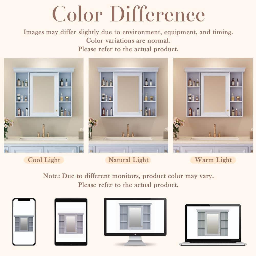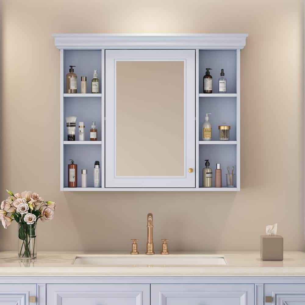 Light Blue 35 in. W x 28 in. H Rectangular Bathroom Medicine Cabinet with Mirror, Wall Mirror Cabinet with Open Shelves