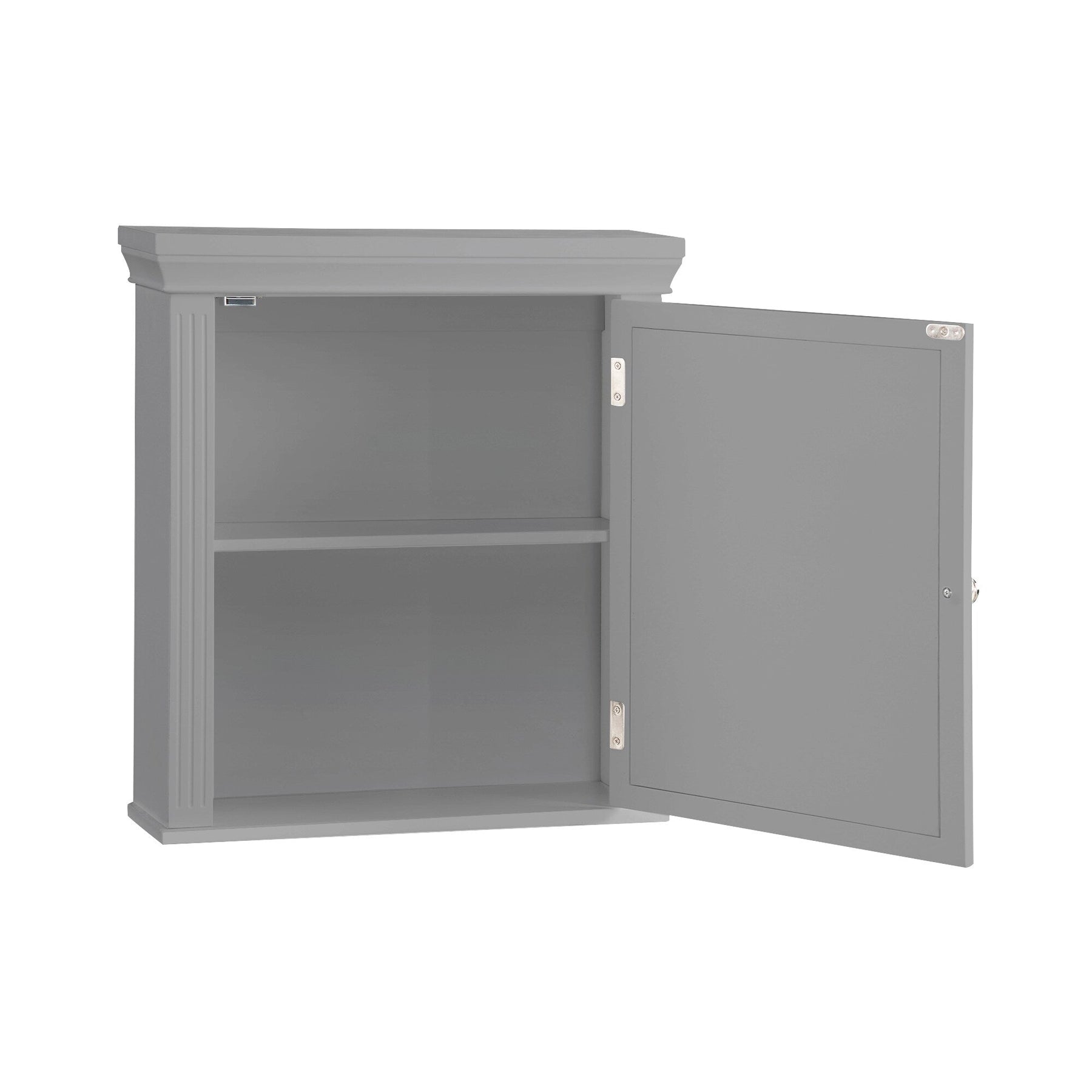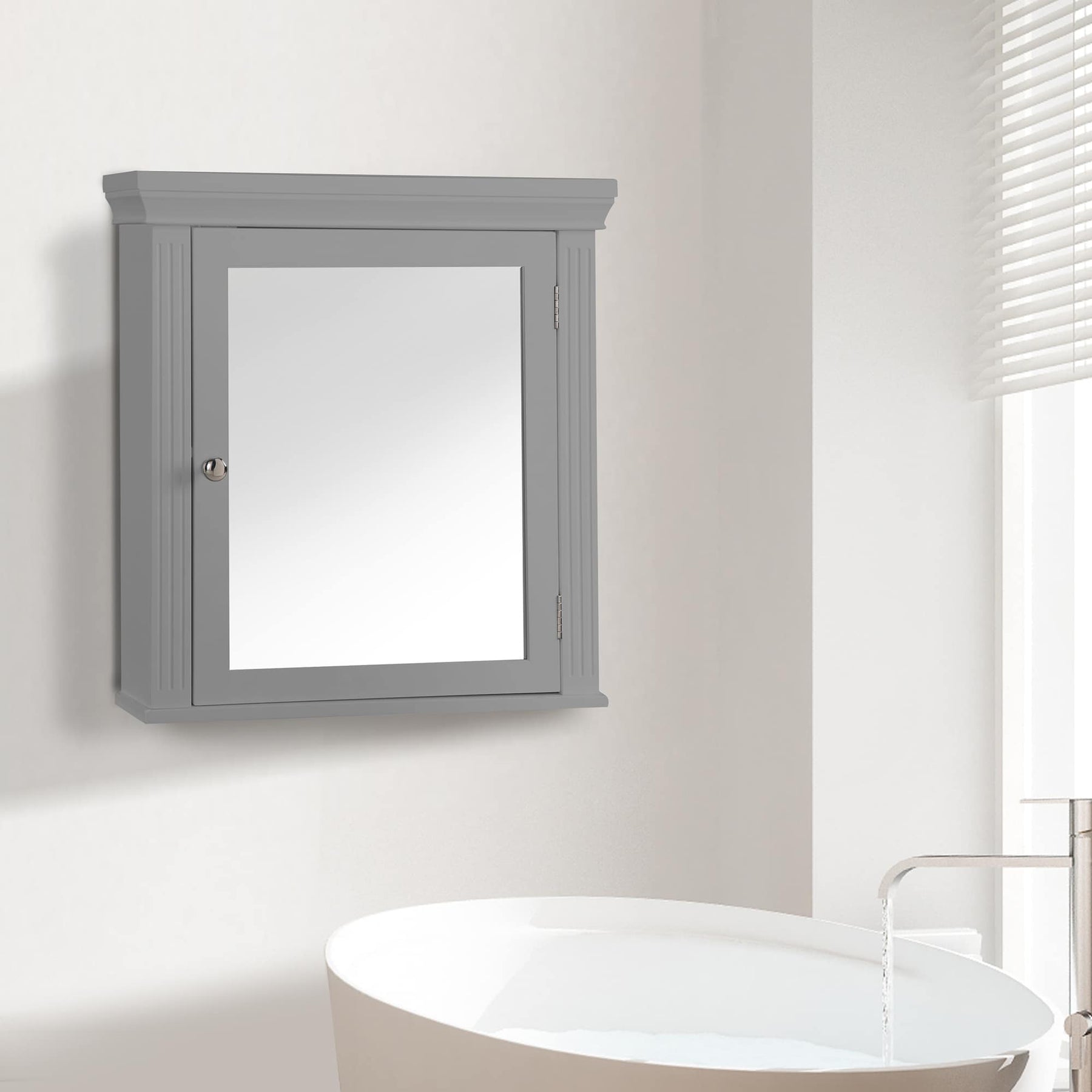 - Design: Shaker-style with mirrored door and decorative crown molding in gray.