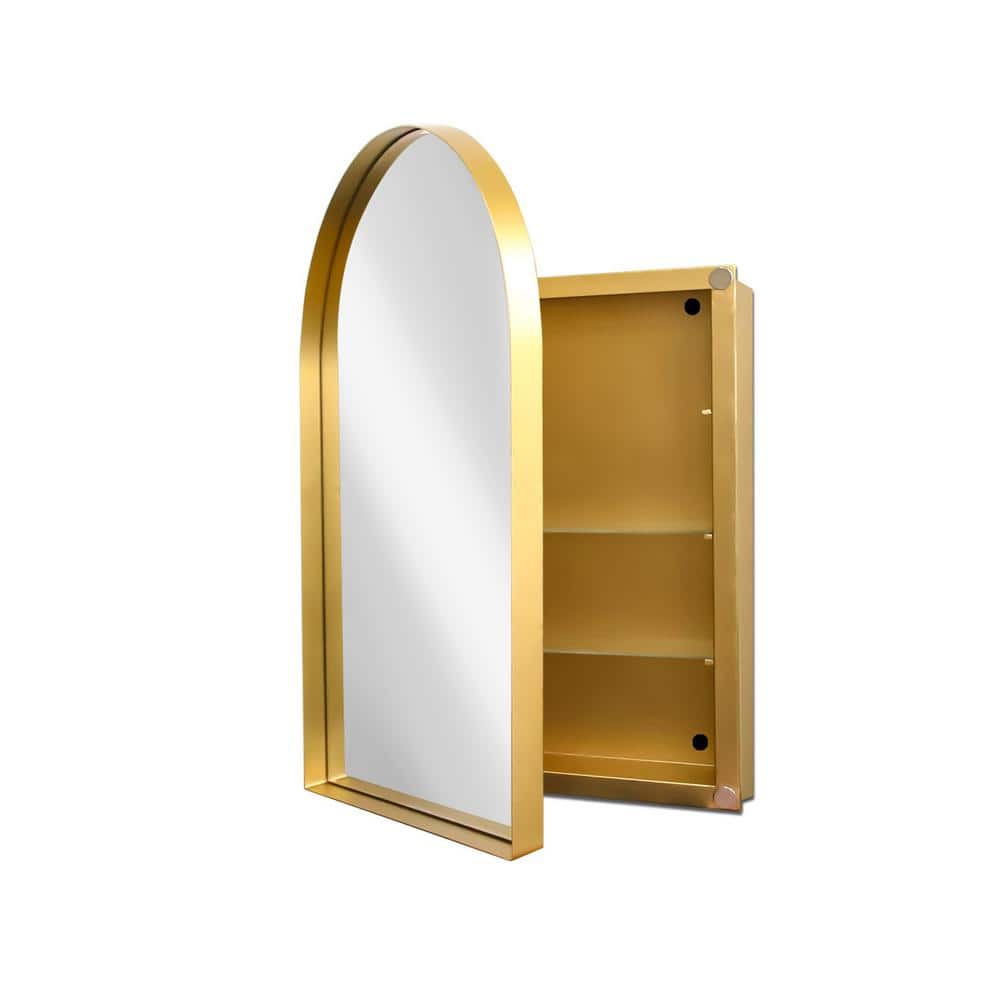 Tenleaf 24 in. W x 36 in. H Arched Recessed Metal Medicine Cabinet with Mirror and Adjustable Shelves in Matte Gold