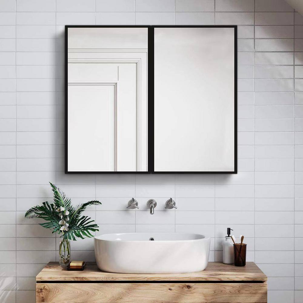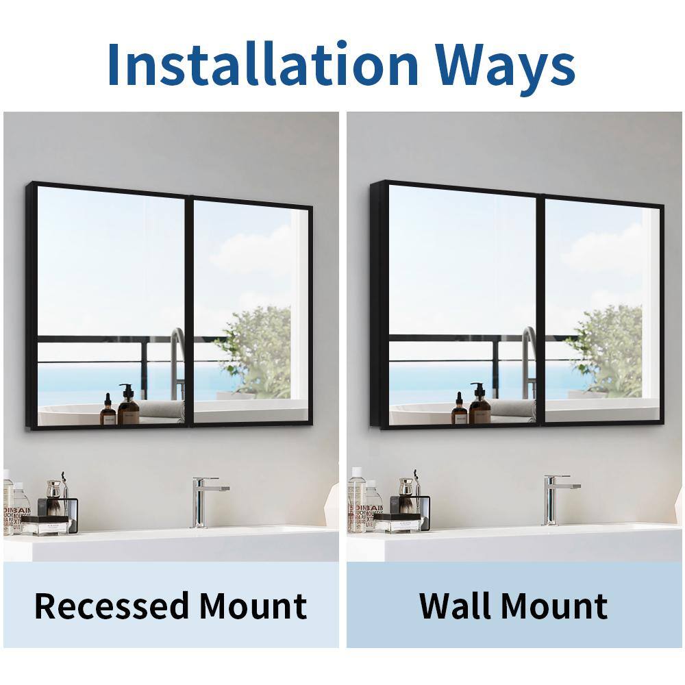 Tileon 30 in. W x 26 in. H Black Metal Framed Rectangular Wall Mount/Recessed Bathroom Medicine Cabinet with Mirror